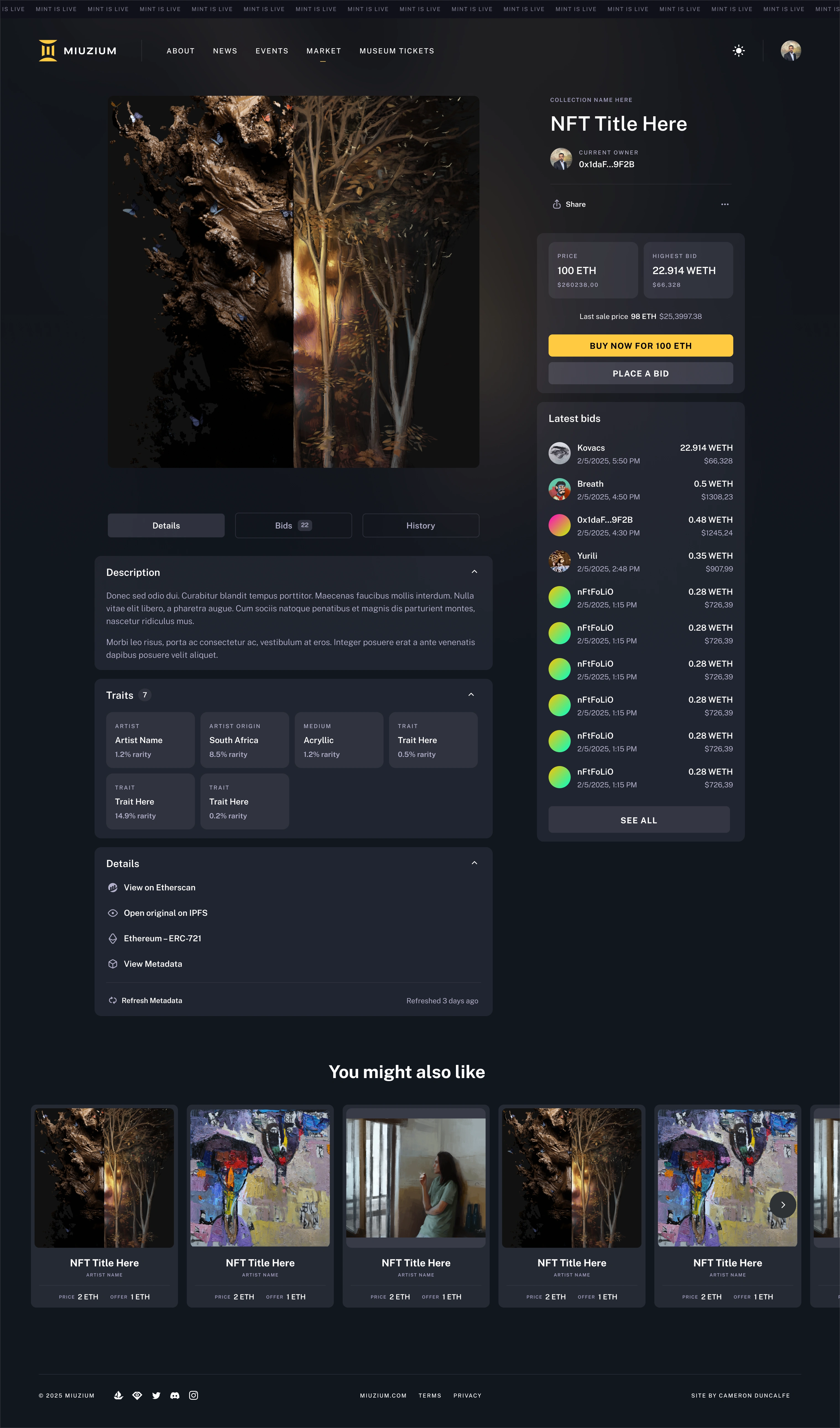 I partnered with Miuzium to design the full end-to-end platform experience — from mint to marketplace — across 36 total screens (18 in both light and dark mode).