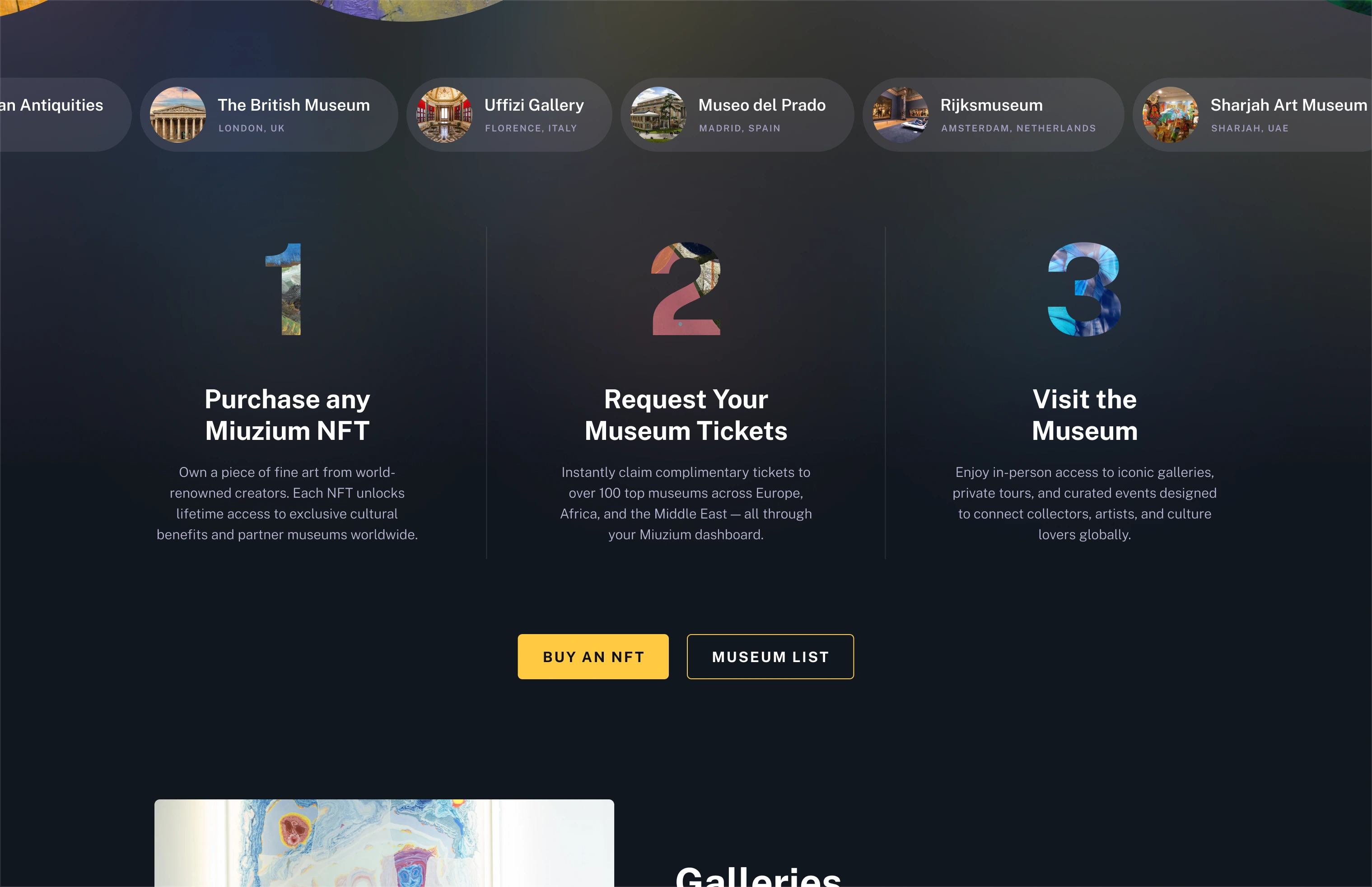 Miuzium is a fine-art NFT platform granting collectors 1/1 artworks and lifetime access to 100+ top global museums, events, and an exclusive art community.