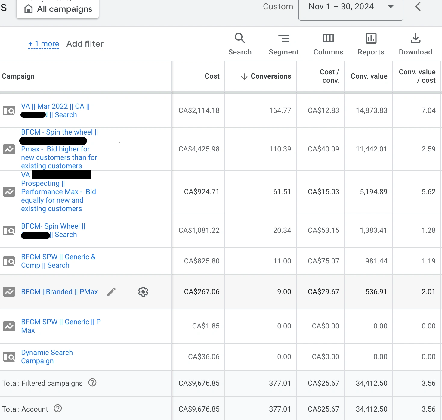 Snapshot showing KPI's for one of the e-commerce client I have worked with in 2024. Please note that Conv. Value / cost is the ROAS.