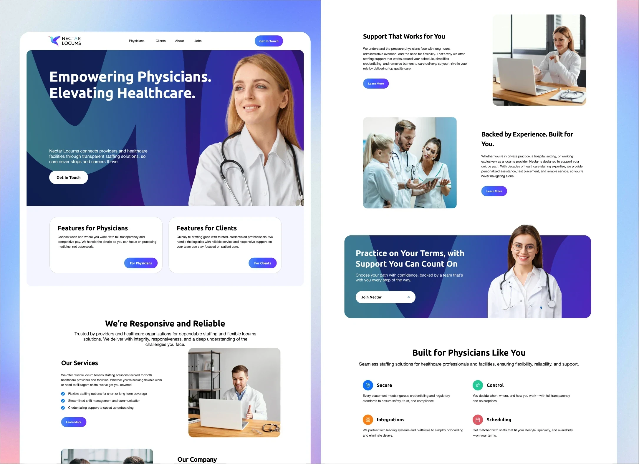 With the wireframes validated, I designed the full Nectar Locums website using the established brand identity. The design aimed to feel professional, calm, and human, a break from the overly clinical look common in healthcare sites.