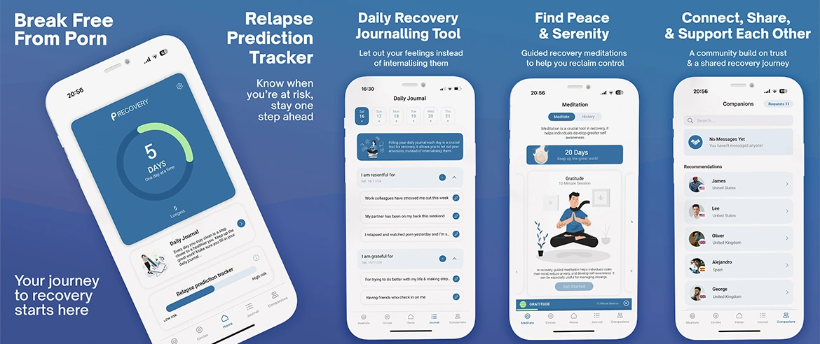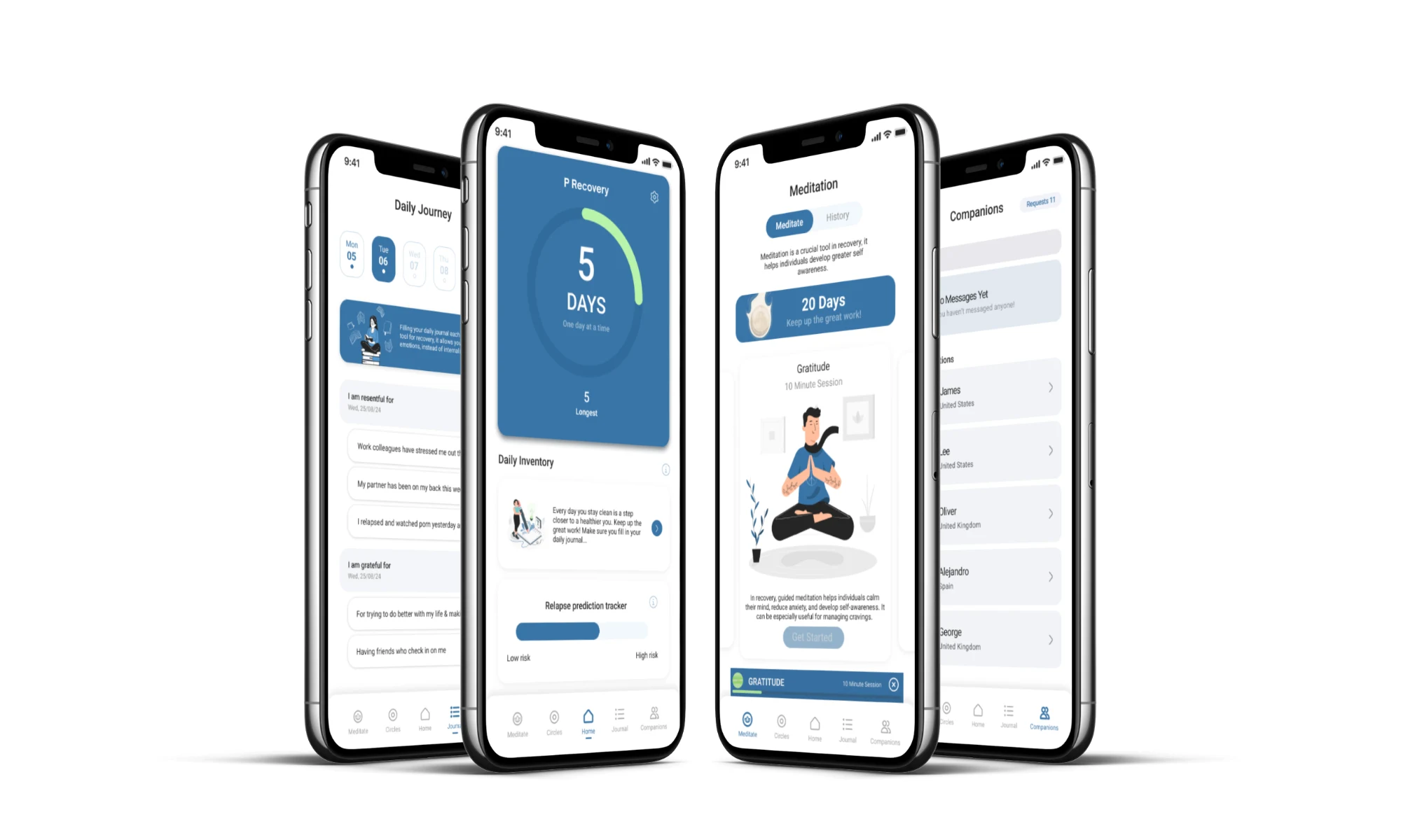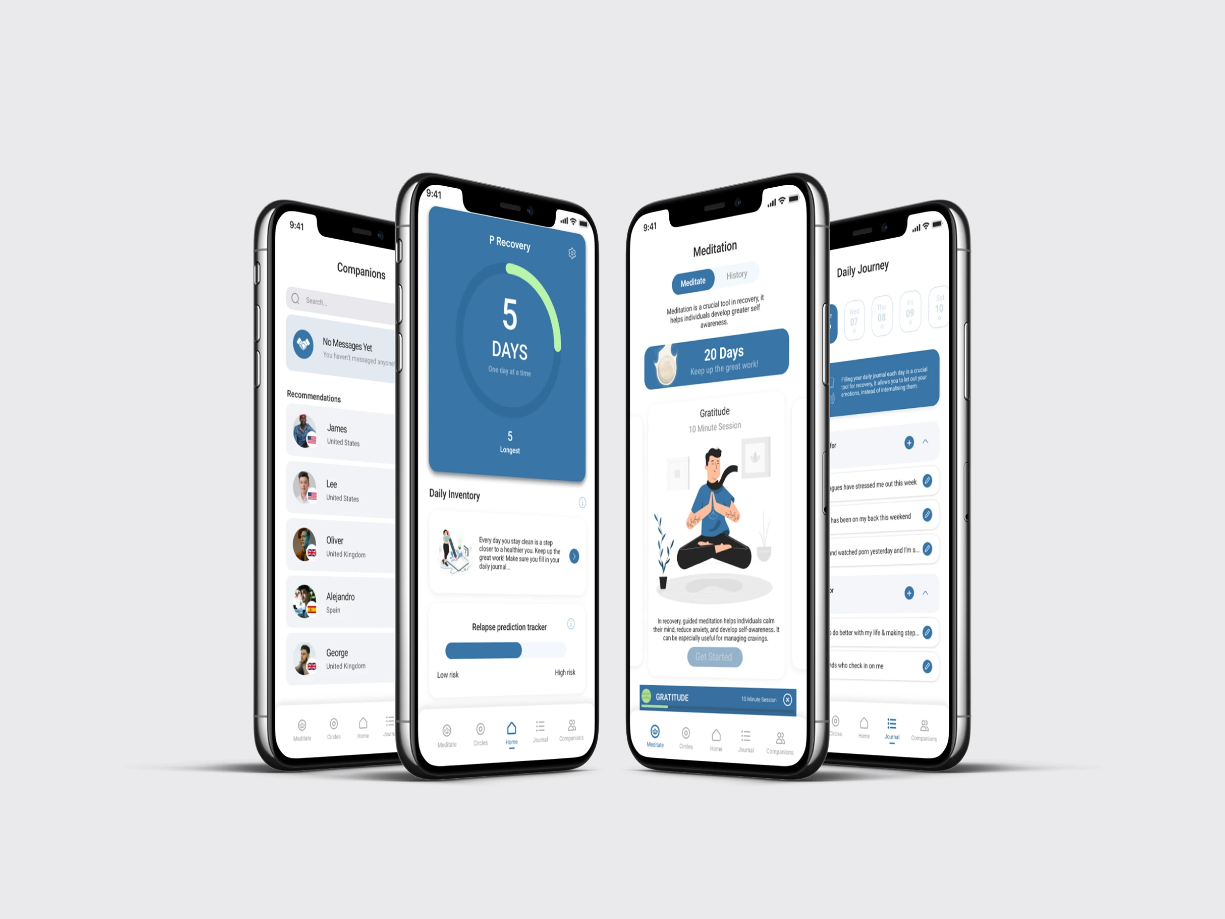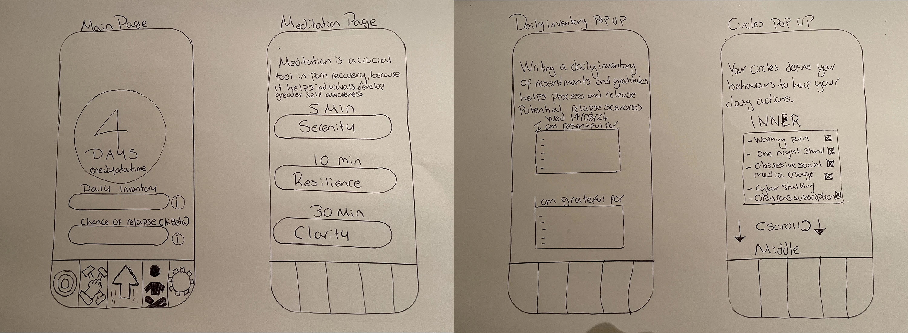 PRecovery is a mobile app which aims to help people manage habit recovery by keeping track of their daily recovery progress, and potential relapse risks. I was tasked with designing an interface and experience that felt safe, supportive, and intuitive. The client had a vision but no solidified UI/UX, and we worked closely together to evolve the app into a structured, encouraging system. We began with their sketches (see below).