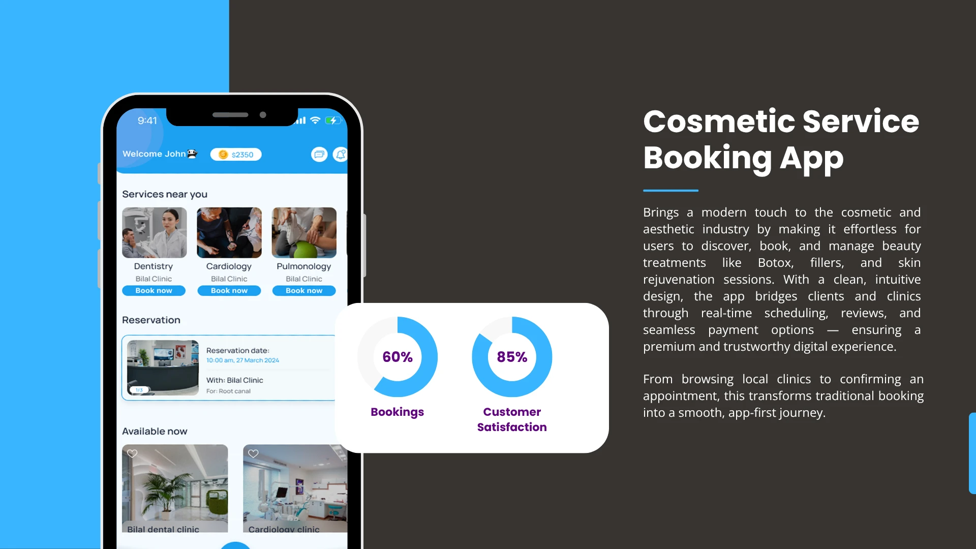 The app integrates real-time scheduling, secure payments, and clinic profiles delivering a smooth and elegant user experience for the beauty &wellness industry.