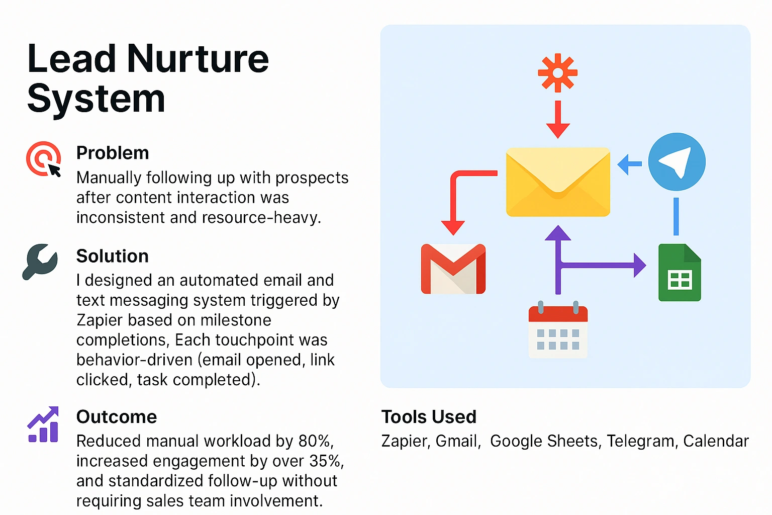 š Problem: No streamlined way to provide consistent touchpoints š ļø Solution: Designed an automated nurture workflow using Zapier, Gmail, and Telegram.