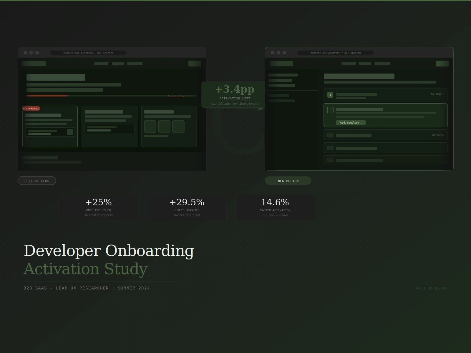 Mixed-methods study to understand why a developer onboarding flow was underperforming. Research-driven redesign delivered a 3.4pp activation lift.