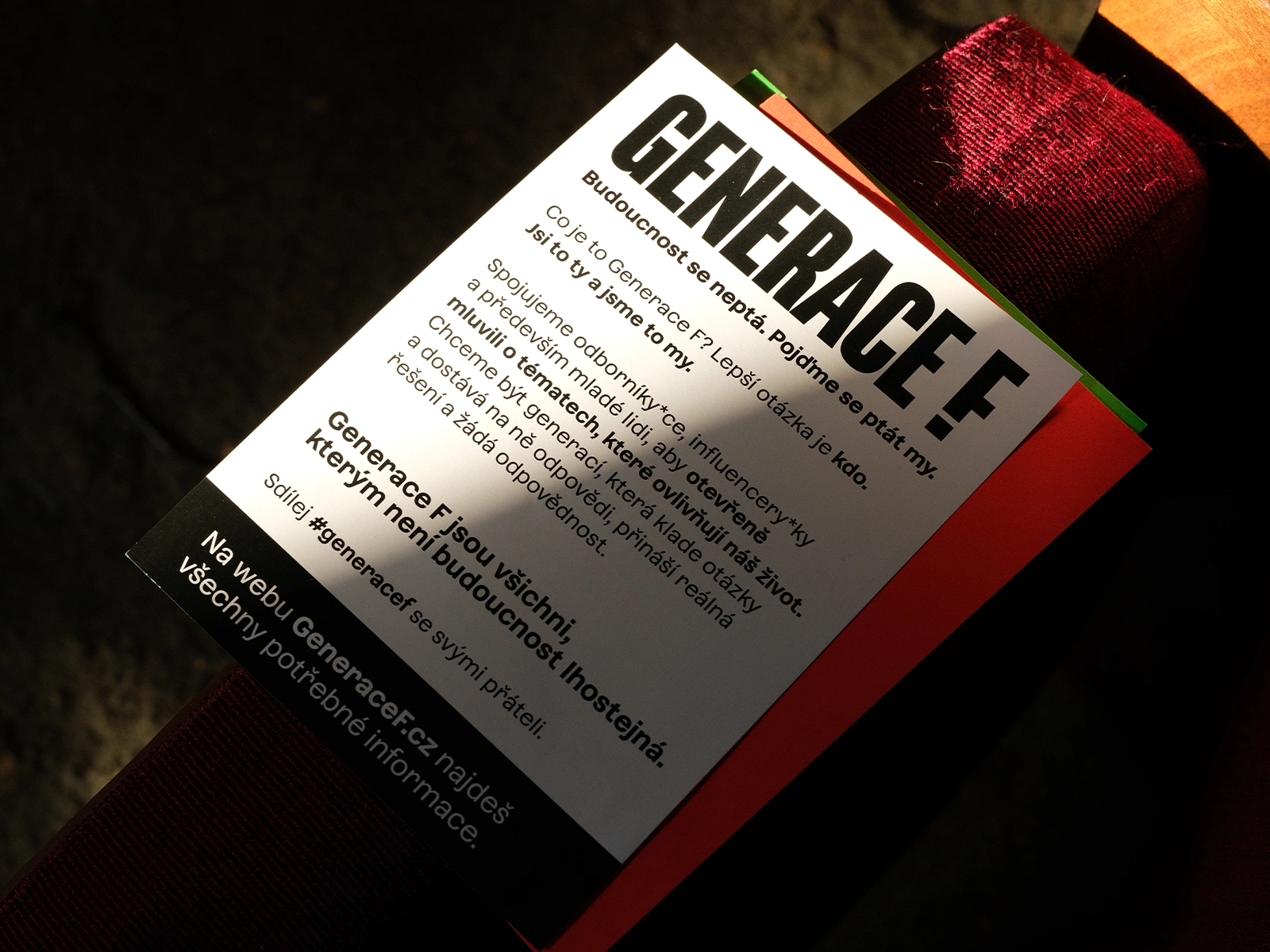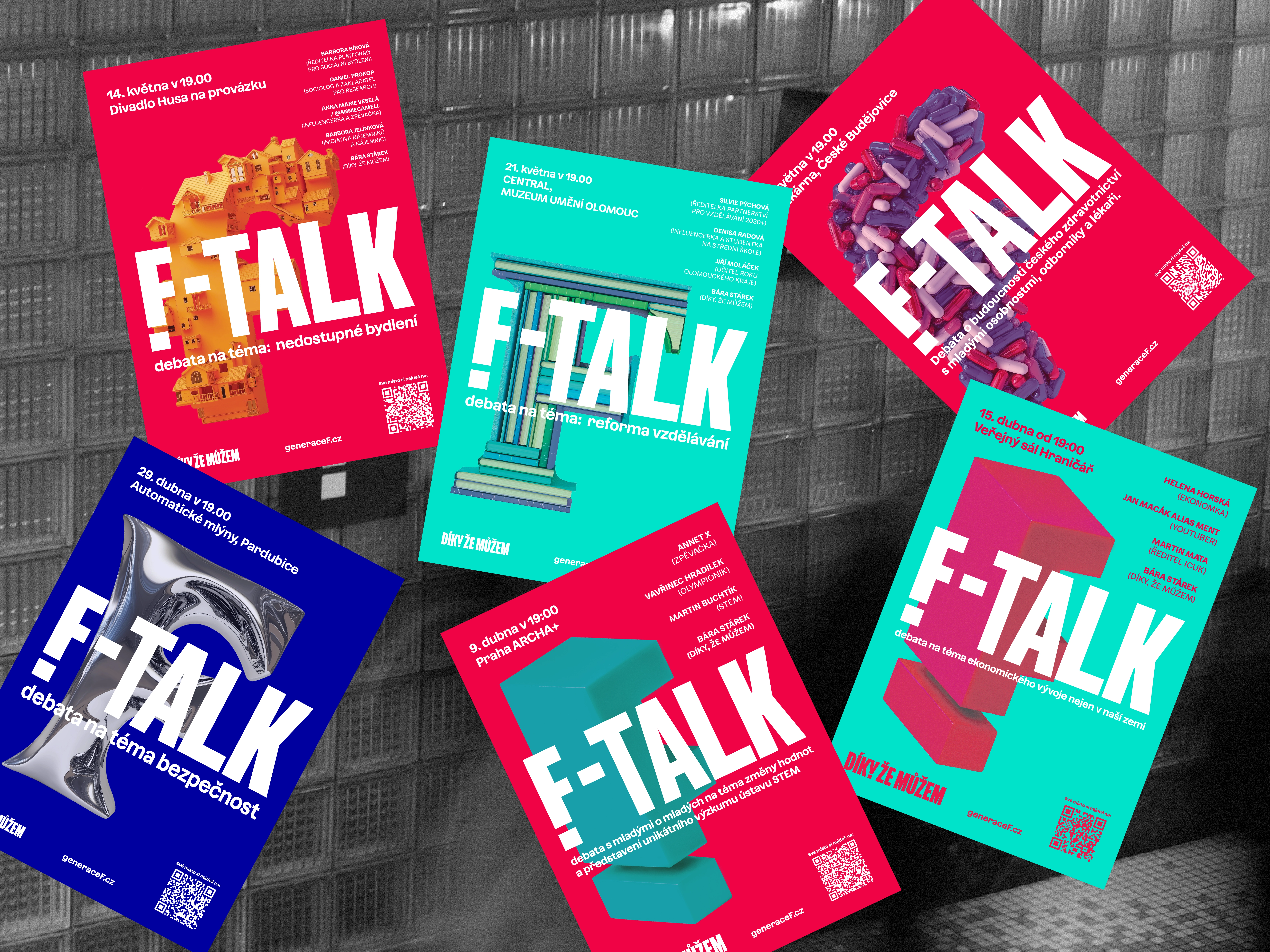 In the end, the solution was to use bold colors mainly for posters, where strong visual impact was essential. For digital communication, I relied more on Díky, že můžem’s core black-and-white palette, using bright colors as accents. We also worked with grainy black-and-white photography, which gave the campaign a raw, distinctive look.