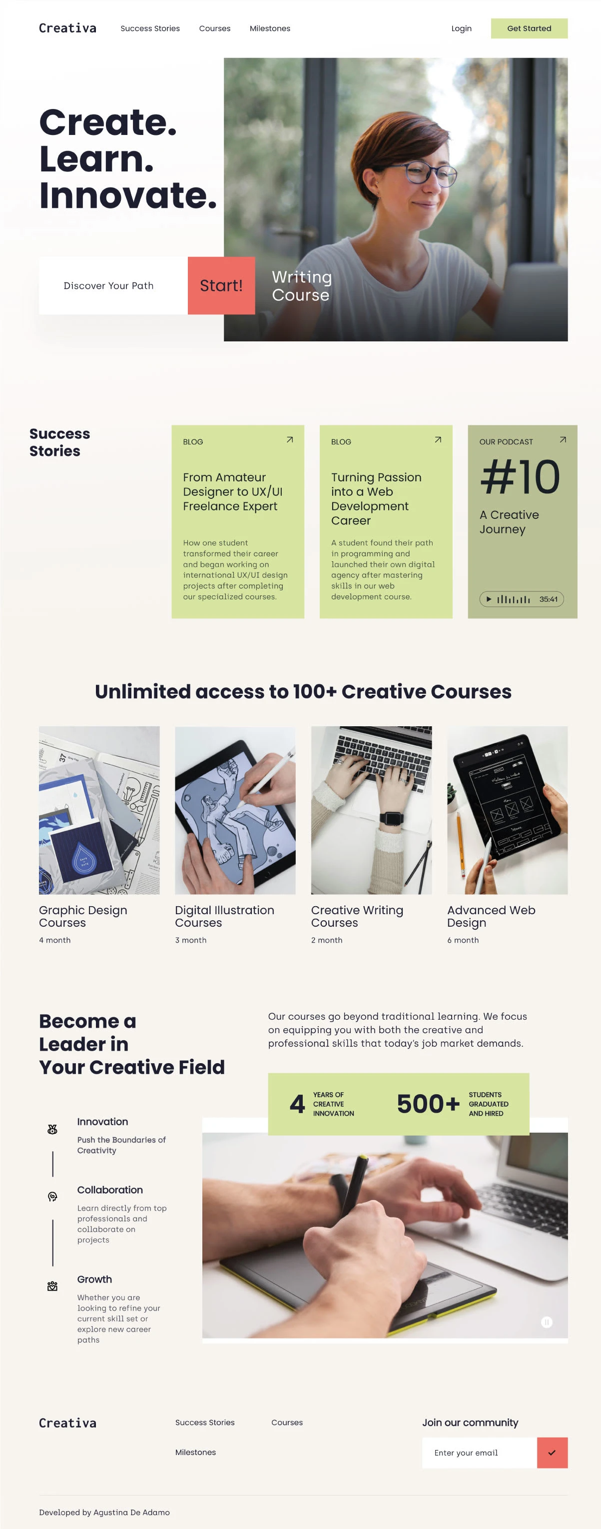 I was in charge of the design, development, and implementation in Webflow of the Landing Page of Creativa Courses SaaS, including all animations.
