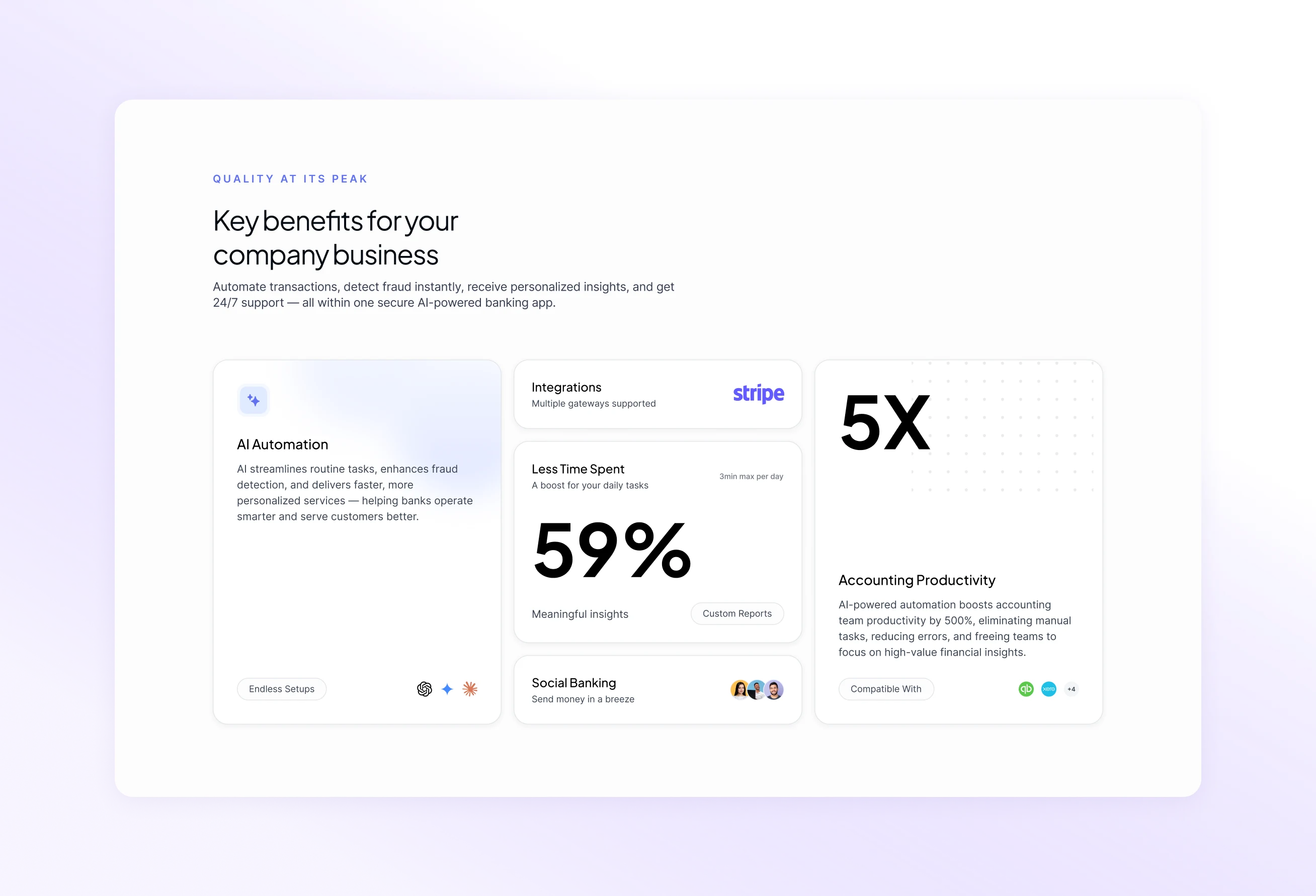 The template showcases a full ecosystem of financial solutions, including features like Smart Banking, Treasury Management, Expense Tracking, Virtual and Corporate Cards, and Capital Expansion. Each section was crafted to highlight functionality while maintaining an elevated, minimalist visual language suitable for fintech startups, SaaS companies, and digital banks.