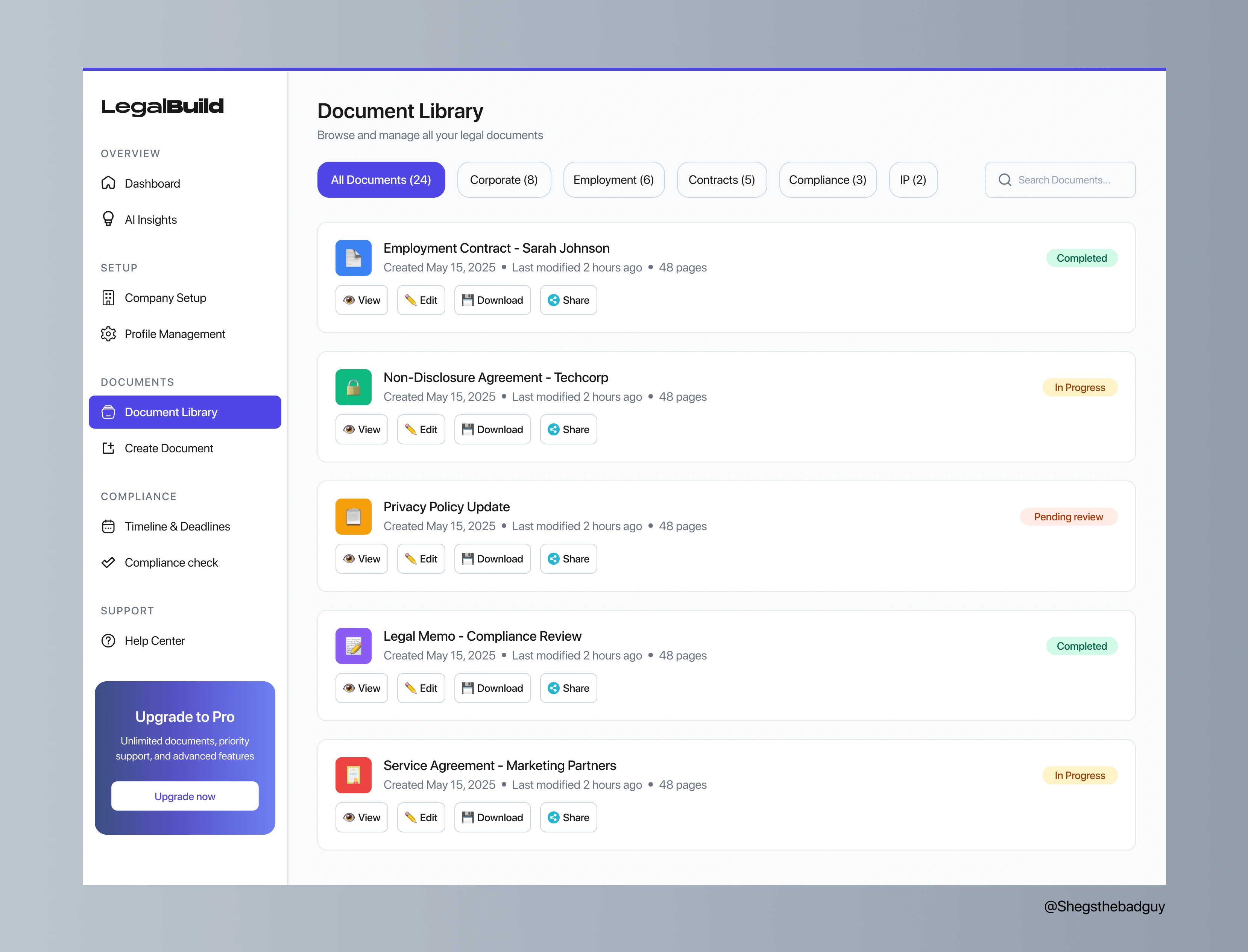 Recently, I've been exploring how AI can streamline one of the most time-consuming aspects of running a startup: legal paperwork. I designed early concepts for an AI platform that helps startups generate and suggest legal documents, ranging from founder agreements to funding documents. All tailored to a company's structure, goals and growth stage. The onboarding flow is designed to be simple yet thorough:
