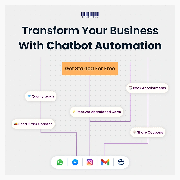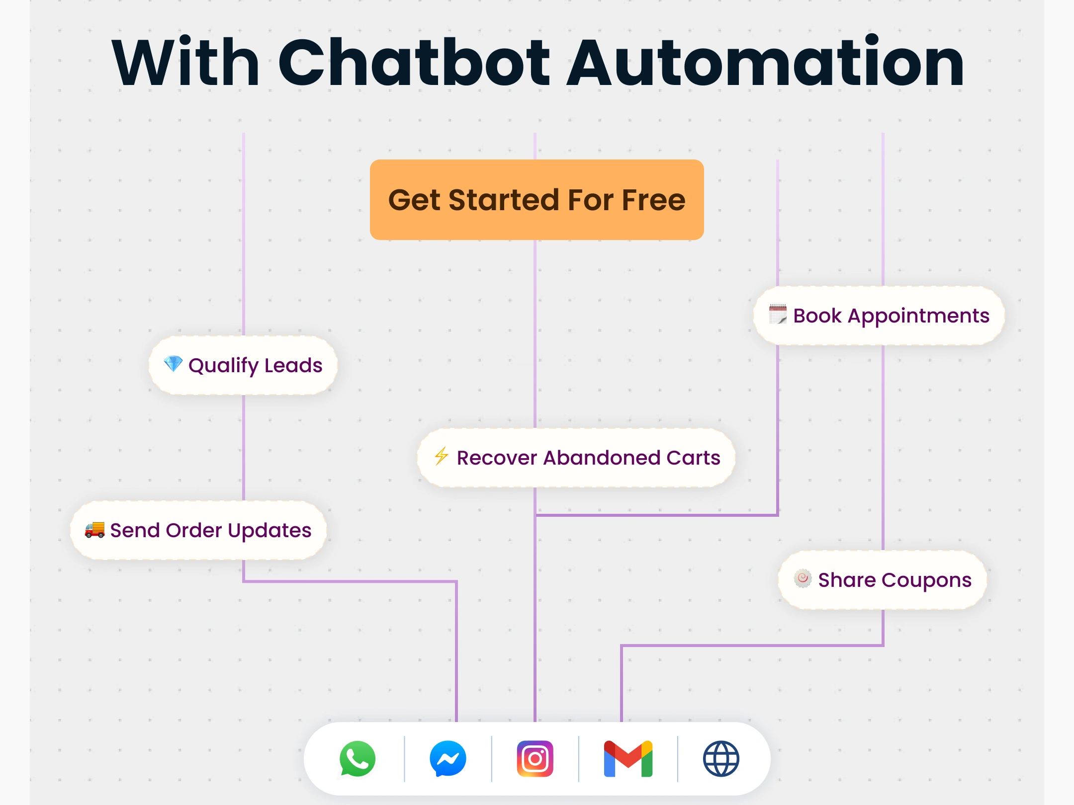 Informative visual promoting chatbot automation with clear benefits like lead generation and cart recovery. Clean layout and icons for multi-platform support.