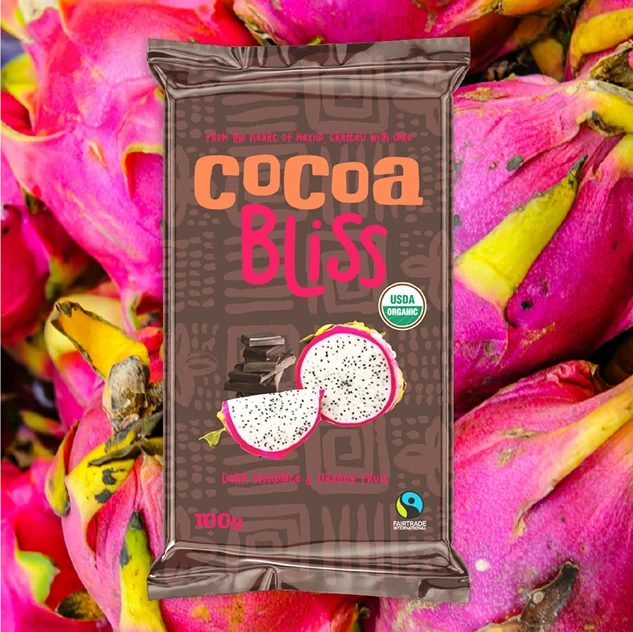 Cocoa Bliss is a Mexican-American chocolate brand bringing organic, ethically sourced cacao from southern Mexico to the U.S. market. With bold flavours and rich cultural roots, Cocoa Bliss introduces a vibrant collection of dark chocolate bars infused with Mexican-grown fruits: Guava, Coconut, and Dragon Fruit.