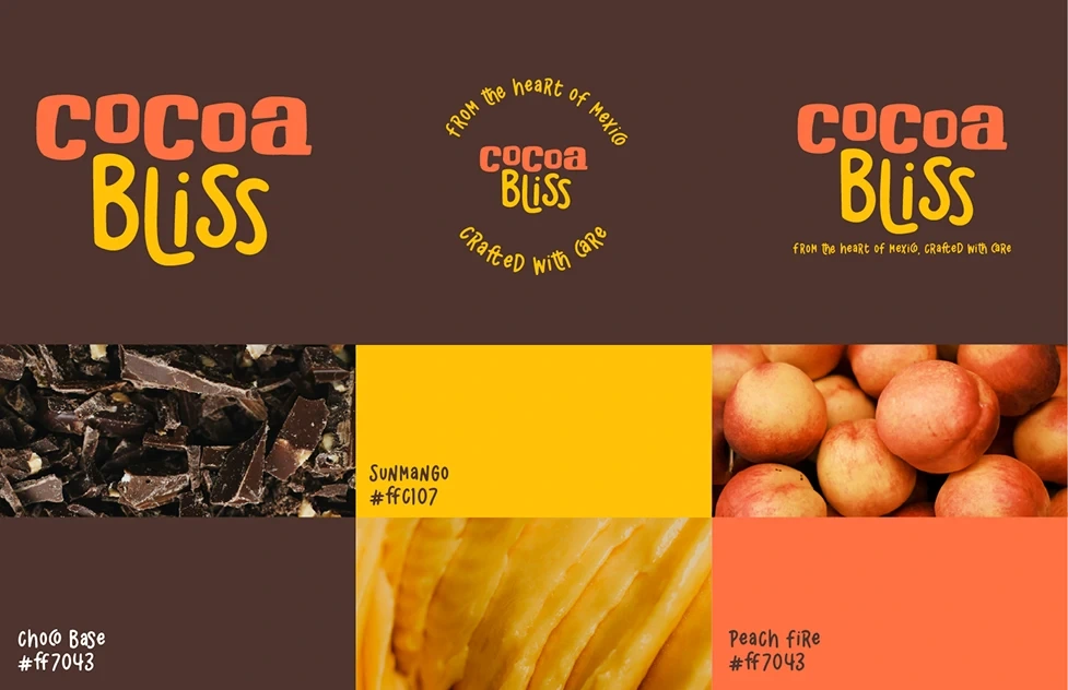 These colours—ChocoPace (#4E342E) for the base, Peach Fire (#FF7043) for the word "Cocoa", and SunMango (#FFC107) for the word "Bliss"—were chosen to reflect the product's natural ingredients and tropical flavour roots.
