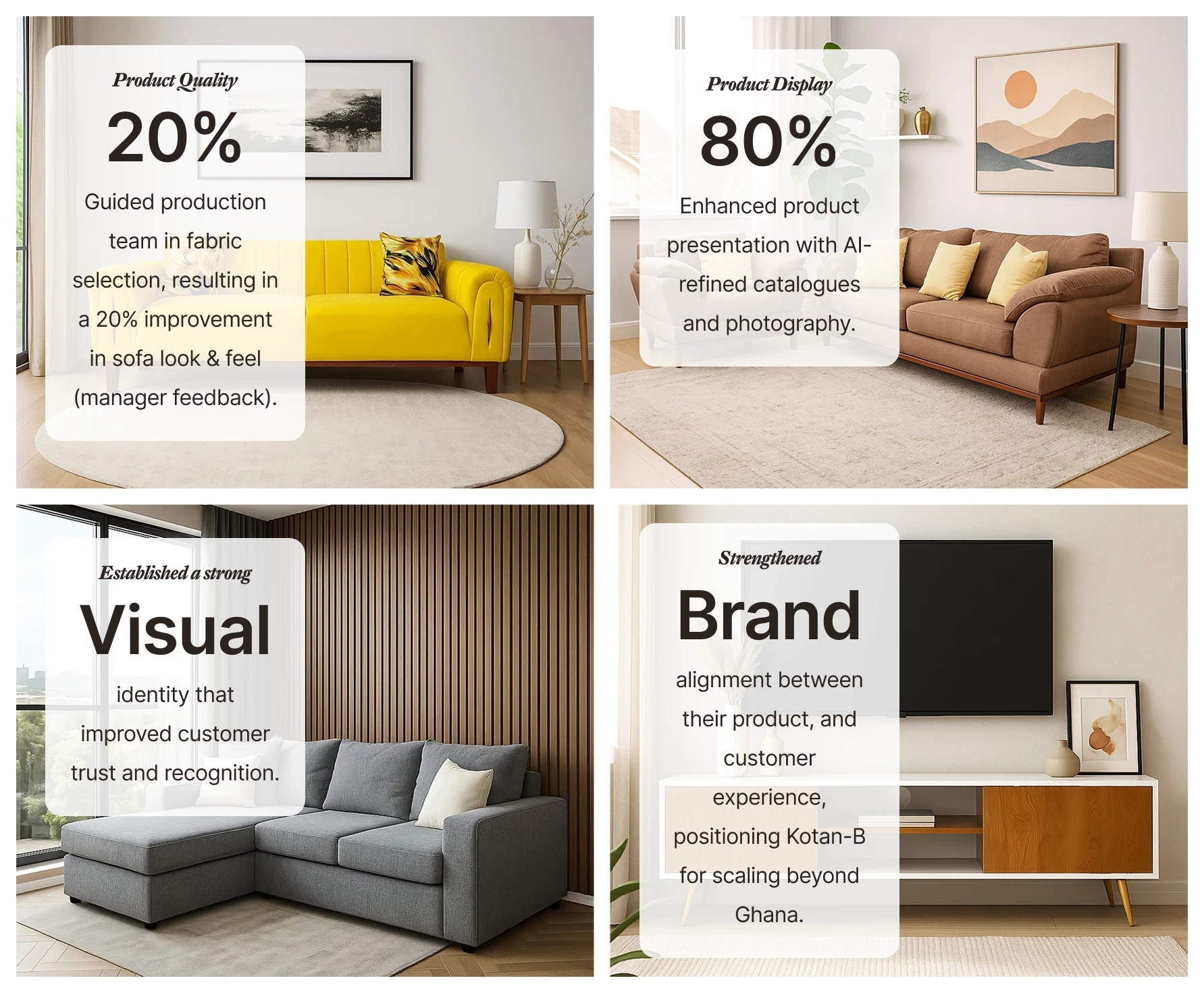 The business relied heavily on showroom sales and paid social ads, but conversions were slow due to unclear branding, poor visuals, and unstructured posting. Solution → Launched a responsive e-commerce site, designed social templates, and trained staff on brand communication, boosting consistency and digital campaign effectiveness.