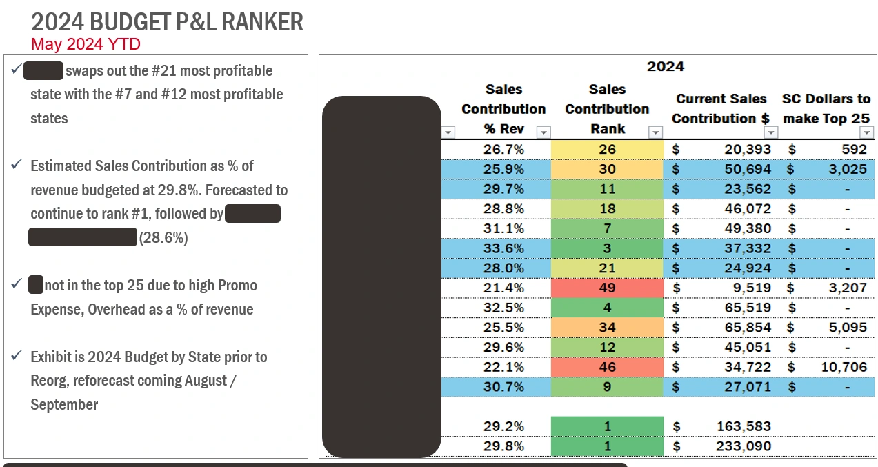 After a GTM re-structure, I built a P&L to highlight profitability, and ranking based on the new alignment.