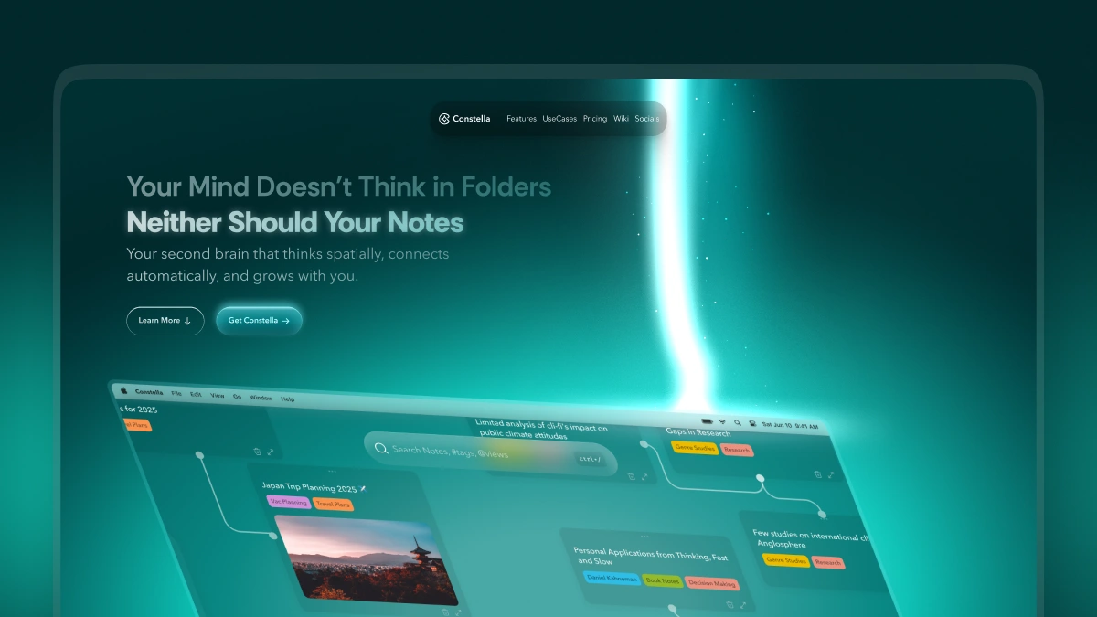 I redesigned the hero, footer, and core sections to bring the brand into alignment: a clearer story, a cleaner layout, and a visual rhythm that matches the spatial second-brain product. The result is a landing page that feels cohesive, communicates value instantly, and makes the product easier to trust.