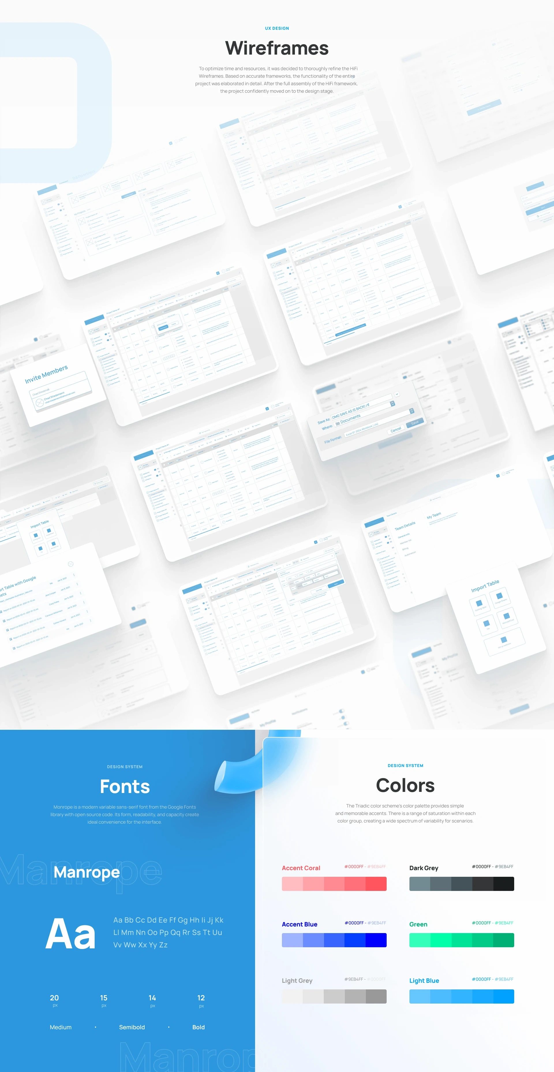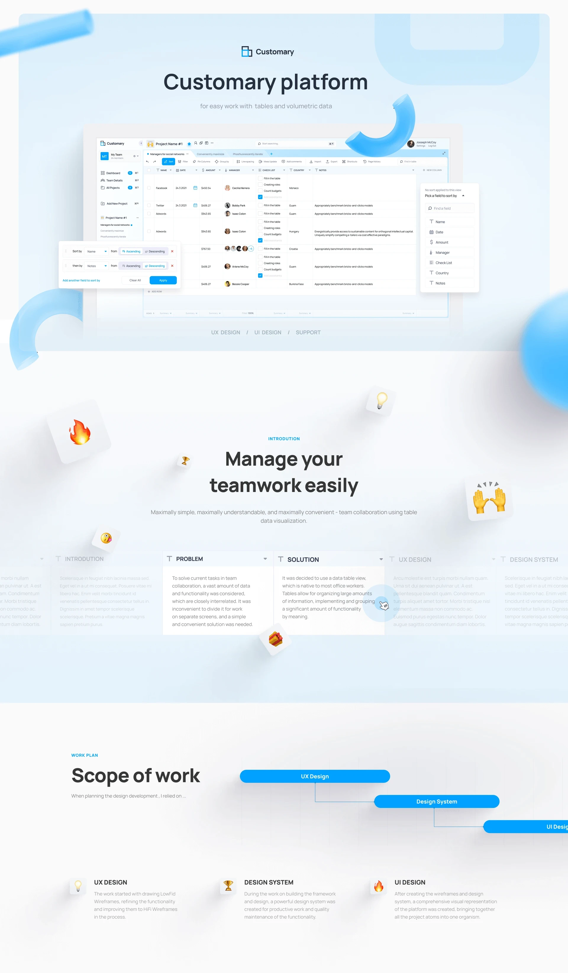 In our design studio, we set out to revolutionize team collaboration through data visualization, prioritizing simplicity, clarity, and convenience. We began by meticulously crafting LowFid Wireframes, refining functionality and upgrading them to HiFi Wireframes. A robust Design System was developed to ensure productive work and maintain functionality quality. Our work culminated in a comprehensive visual representation of the platform, uniting all project elements cohesively. We optimized time and resources by refining HiFi Wireframes and ensuring all control elements were clear and intuitive. Intuitive filters streamlined data sorting, interactive scenarios guided users efficiently, and an impeccable interface facilitated data import/export. In the Personal Profile section, we employed typographic, visual, and color accents to manage extensive information with ease, resulting in an intuitive and user-friendly
