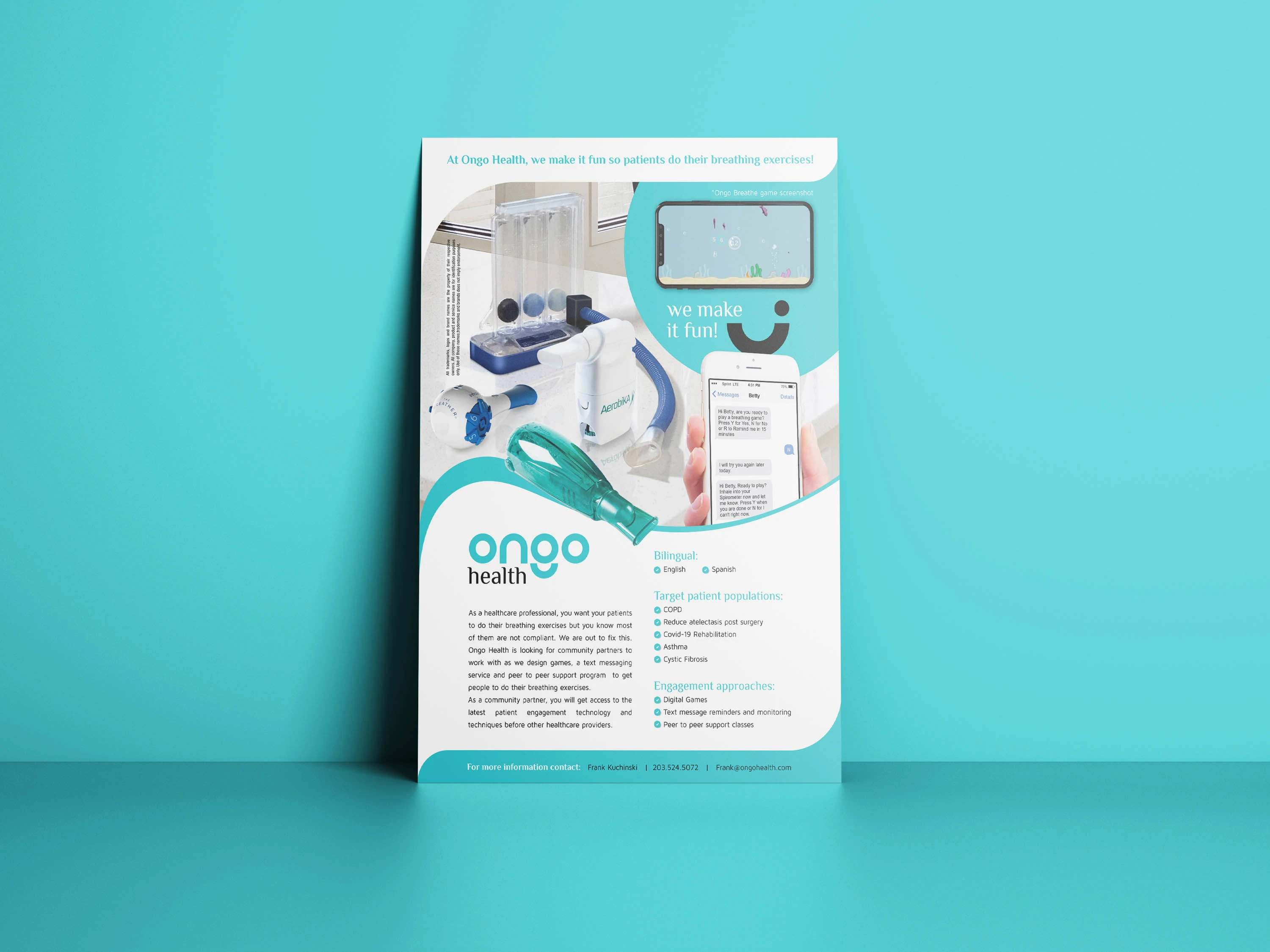 Ongo Health is an American business that uses technology to improve medical therapies. The main product is a spirometer that capture breathing data and help the patient to complete correctly the exercises due the interaction of a coach via text messages and simple exercise games. The data is also sent to the doctor, providing real time analysis of the patient improvement.