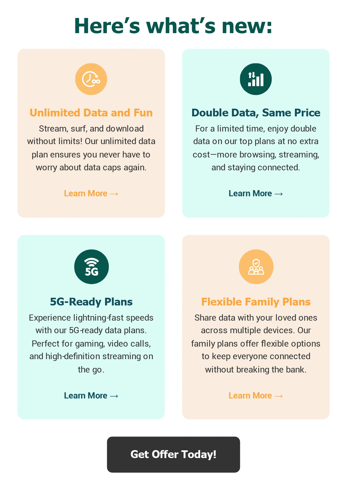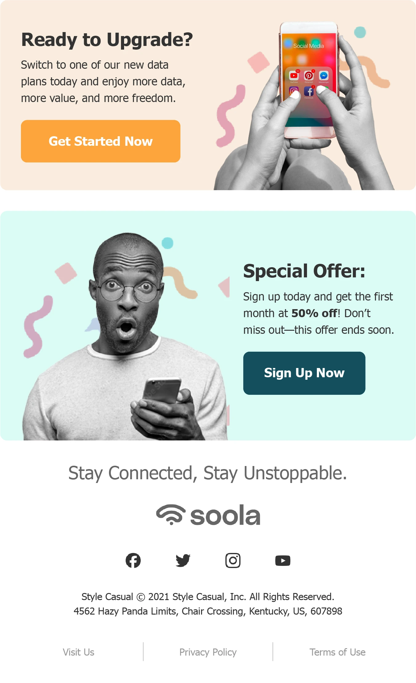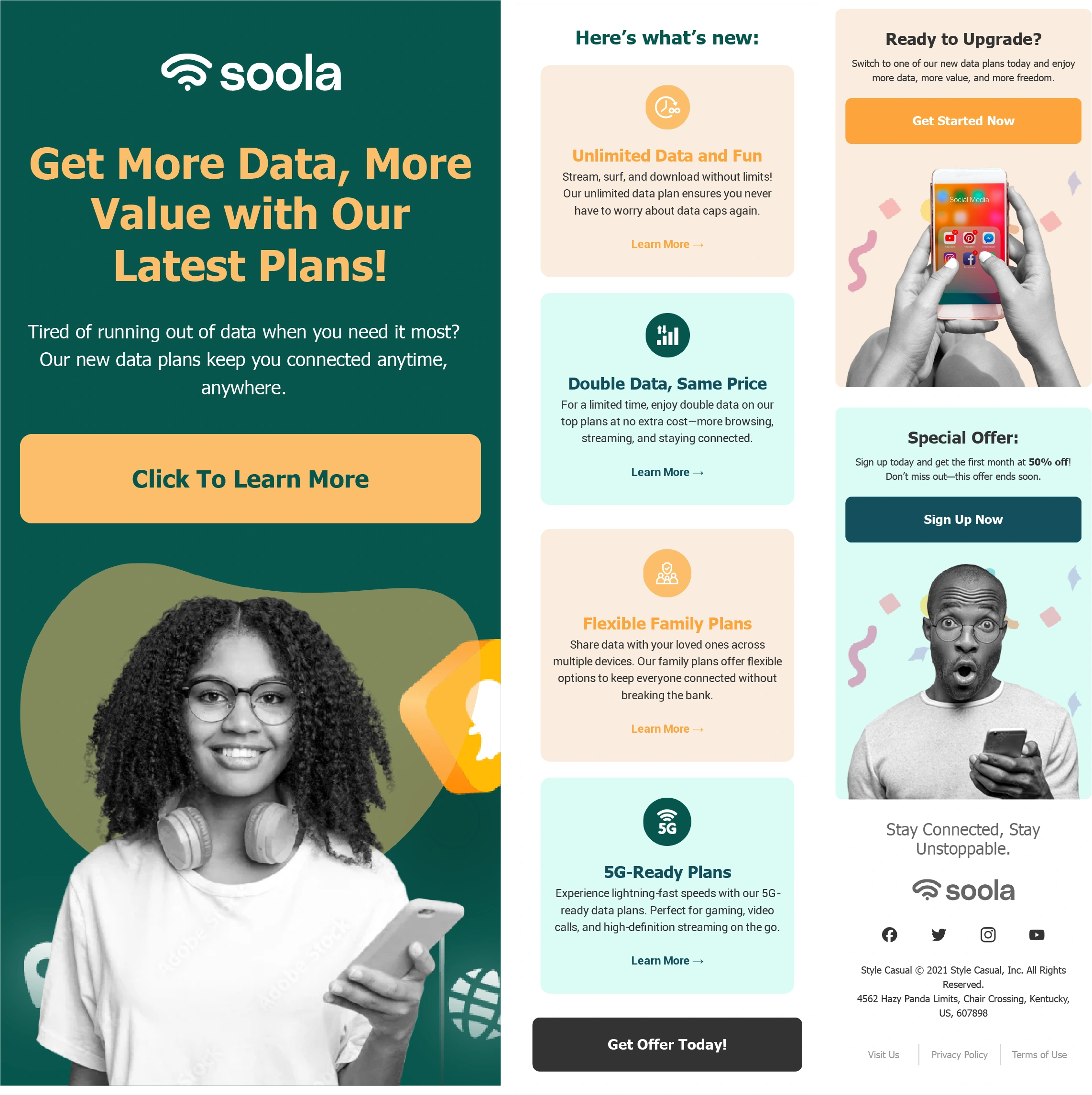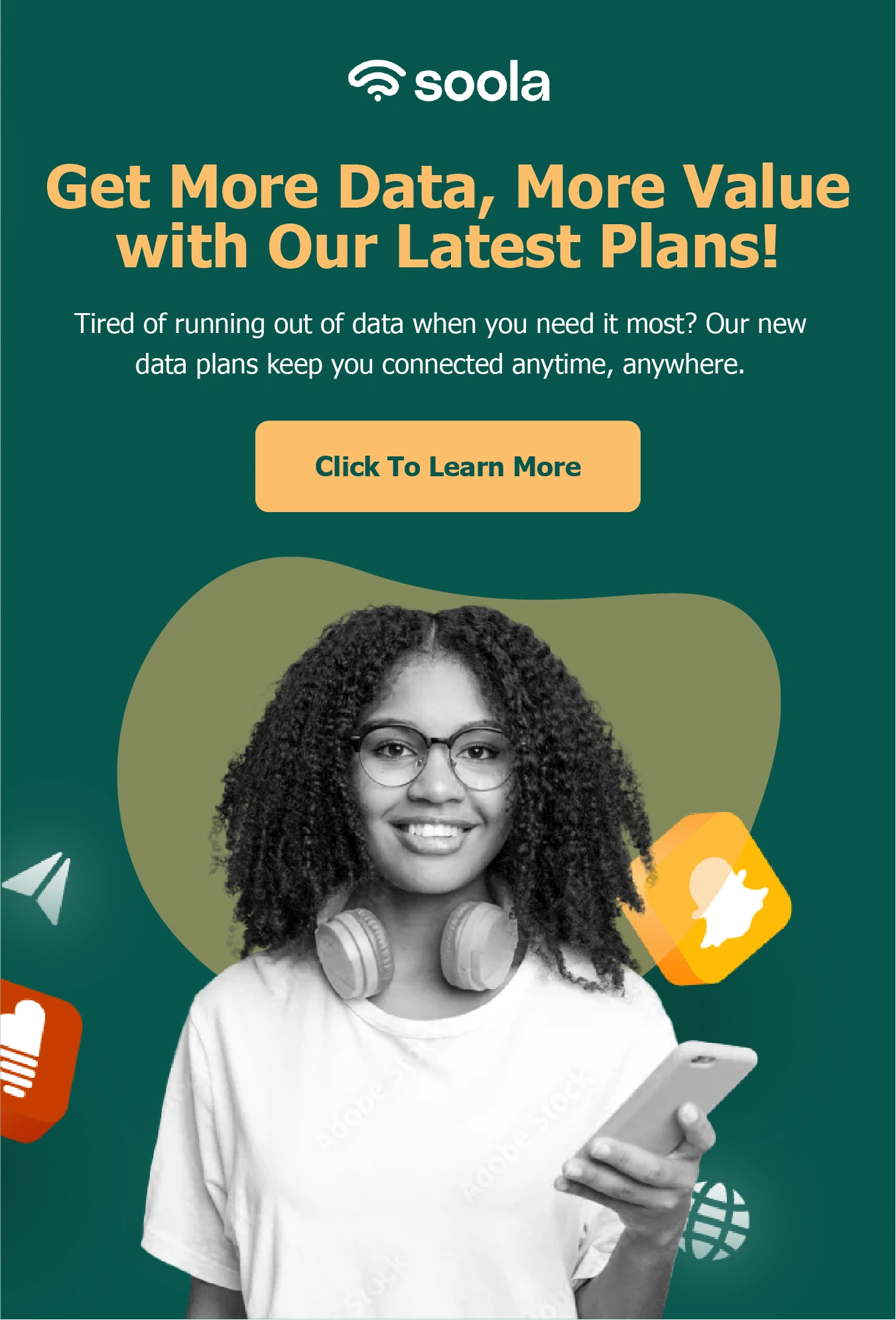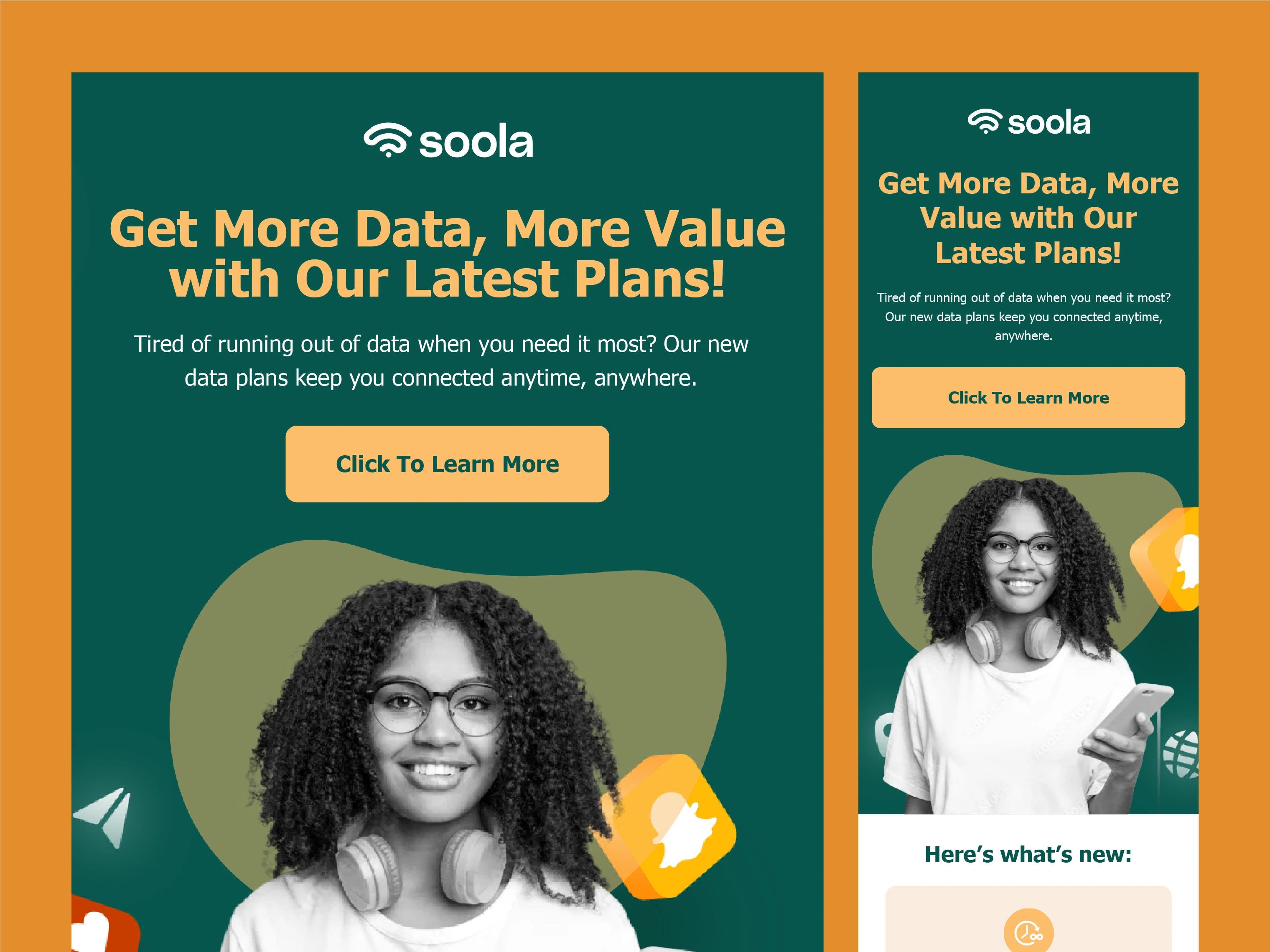The Soola Social Media Data Offer email design combines a vibrant and playful aesthetic with a professional touch. Bright colours and fun icons create a lively, engaging atmosphere, while bold typography draws attention to the exclusive offer. The layout is clean and easy to navigate, with clear call-to-action buttons inviting users to explore their data insights. Playful design elements further enhance the user experience, making the email both visually exciting and informative.
