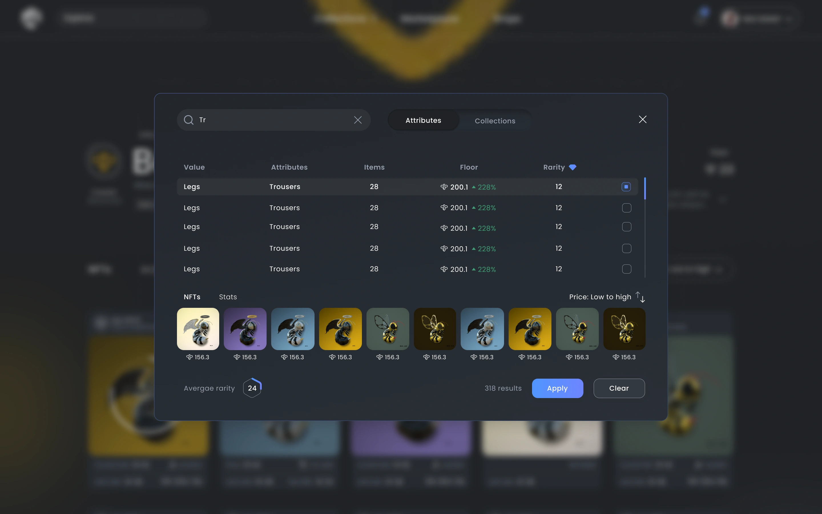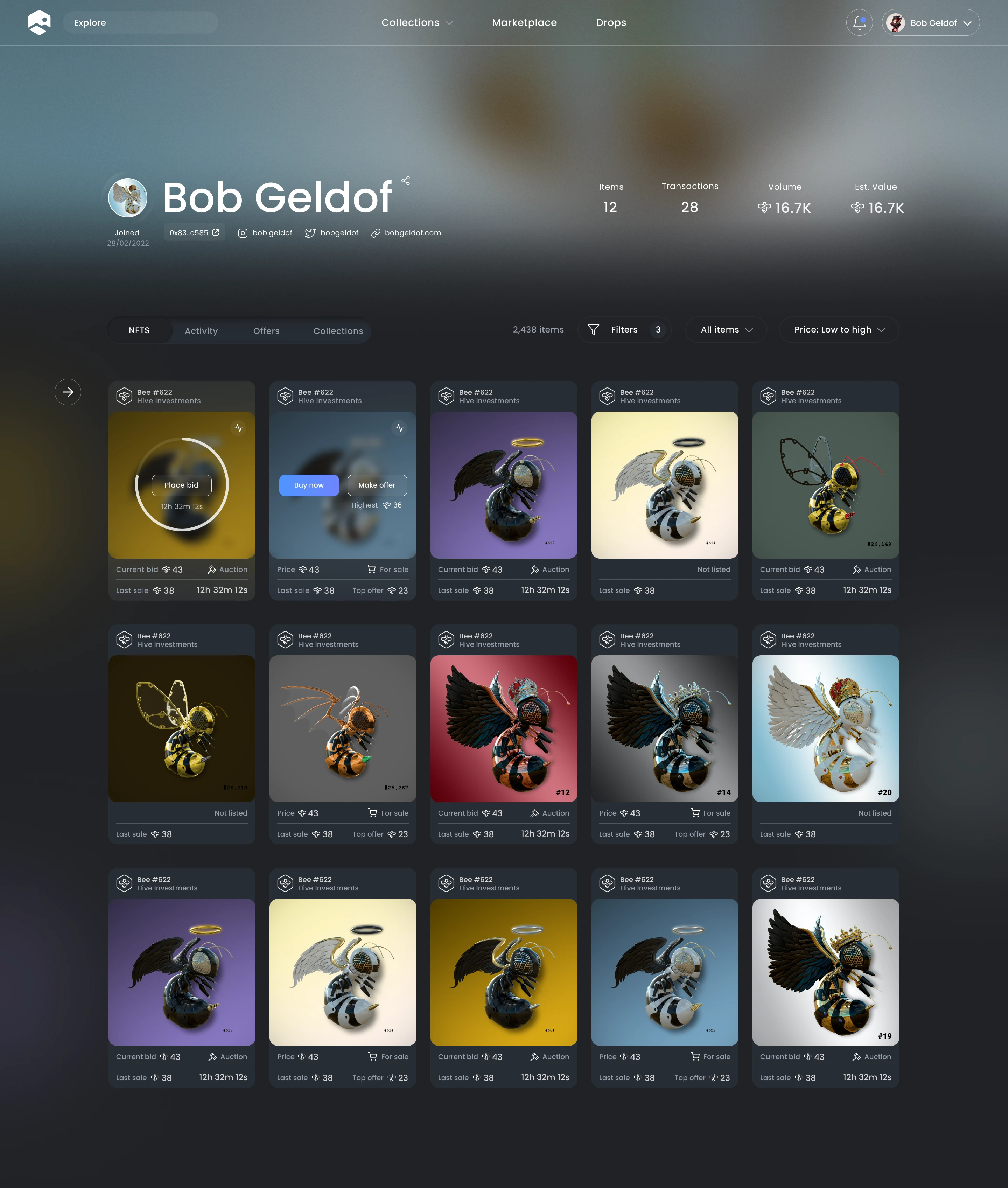The collection page emphasized trust through verification badges, clear statistics (items, owners, volume, floor price), and an intuitive filter system. The "For sale" filter dropdown showcased our unique value prop by including "Has offers" alongside standard listing types.