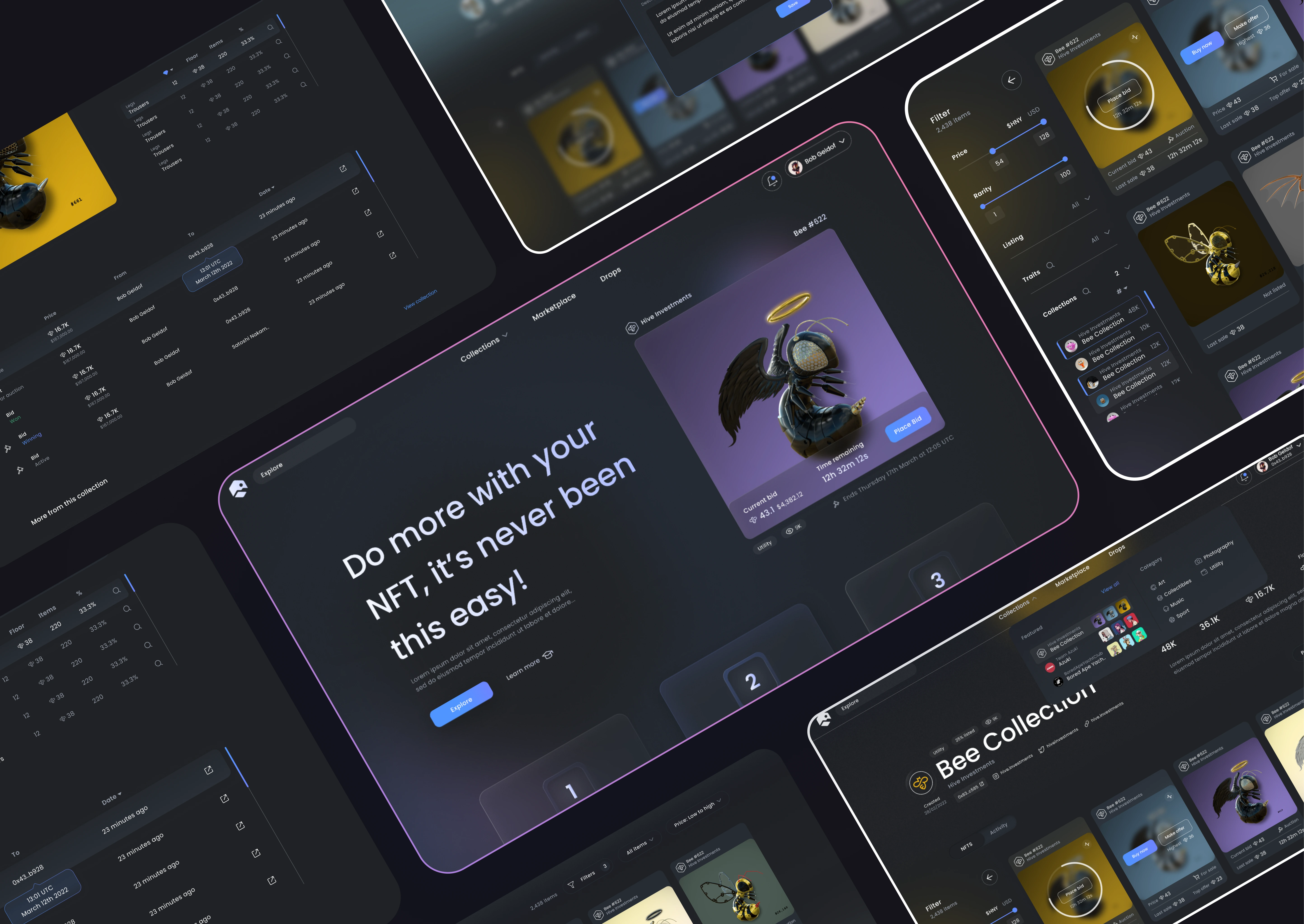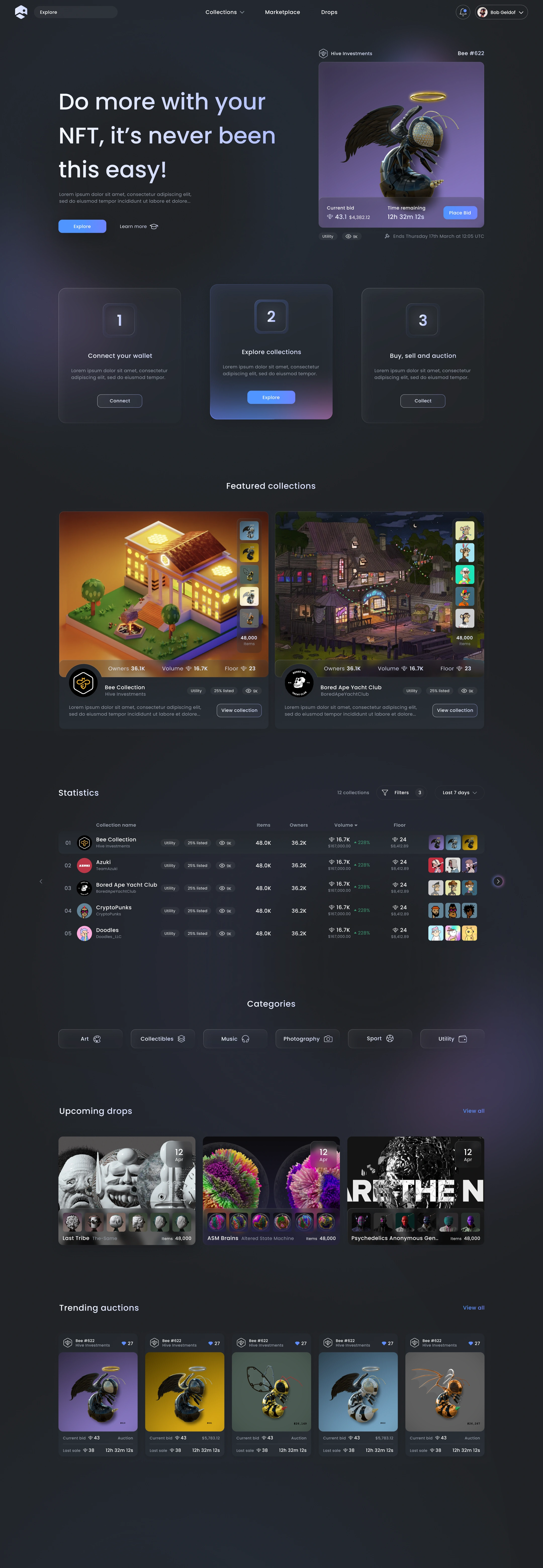 The homepage communicated our three-step process (Connect wallet → Explore collections → Buy, sell, or trade) with bold typography and featured collections showcasing platform quality.