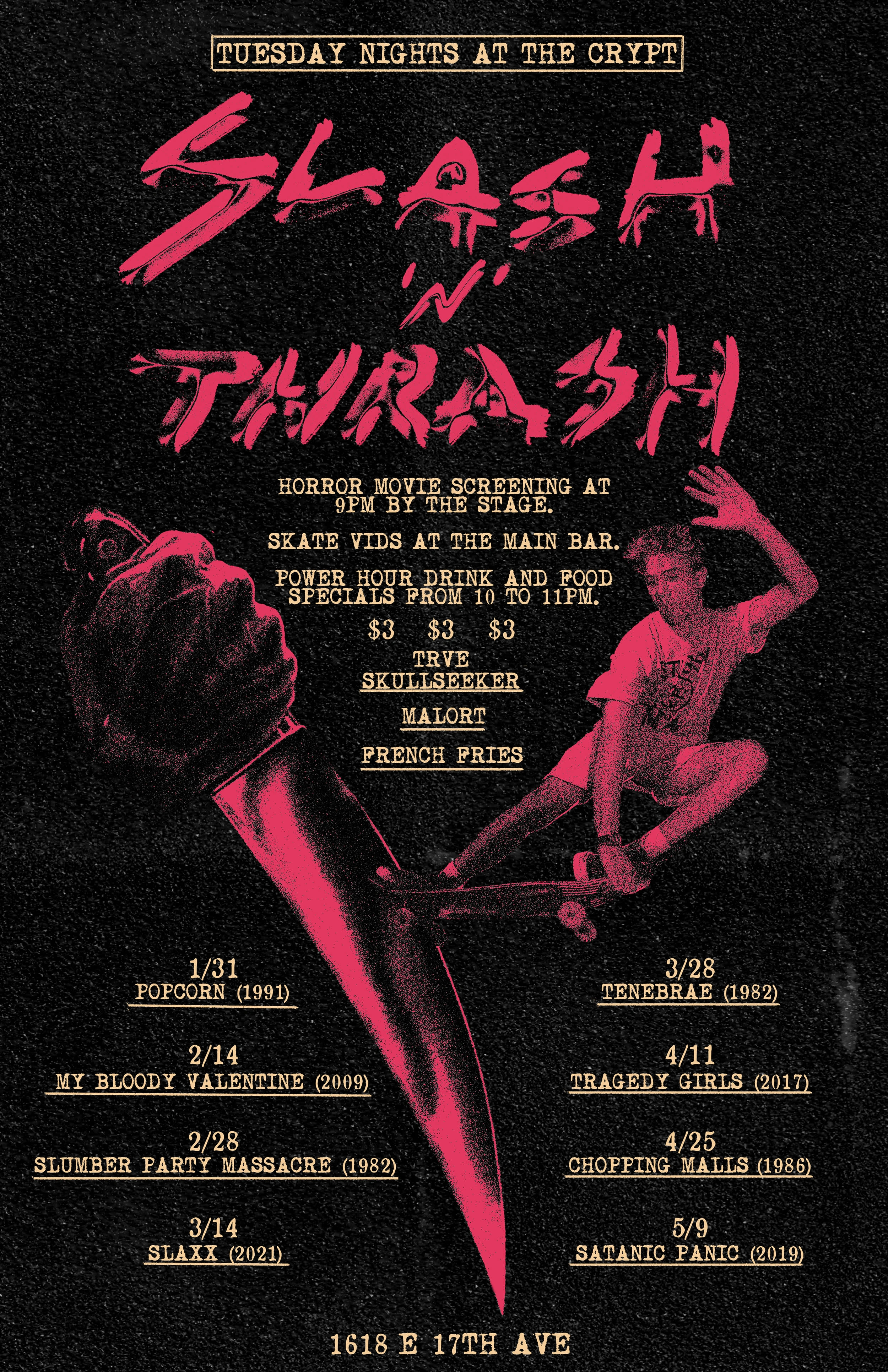 Designed a punk-horror calendar poster for a recurring film/skate night. Gritty visuals to highlight movie dates, chaos, and $3 Malört shots.