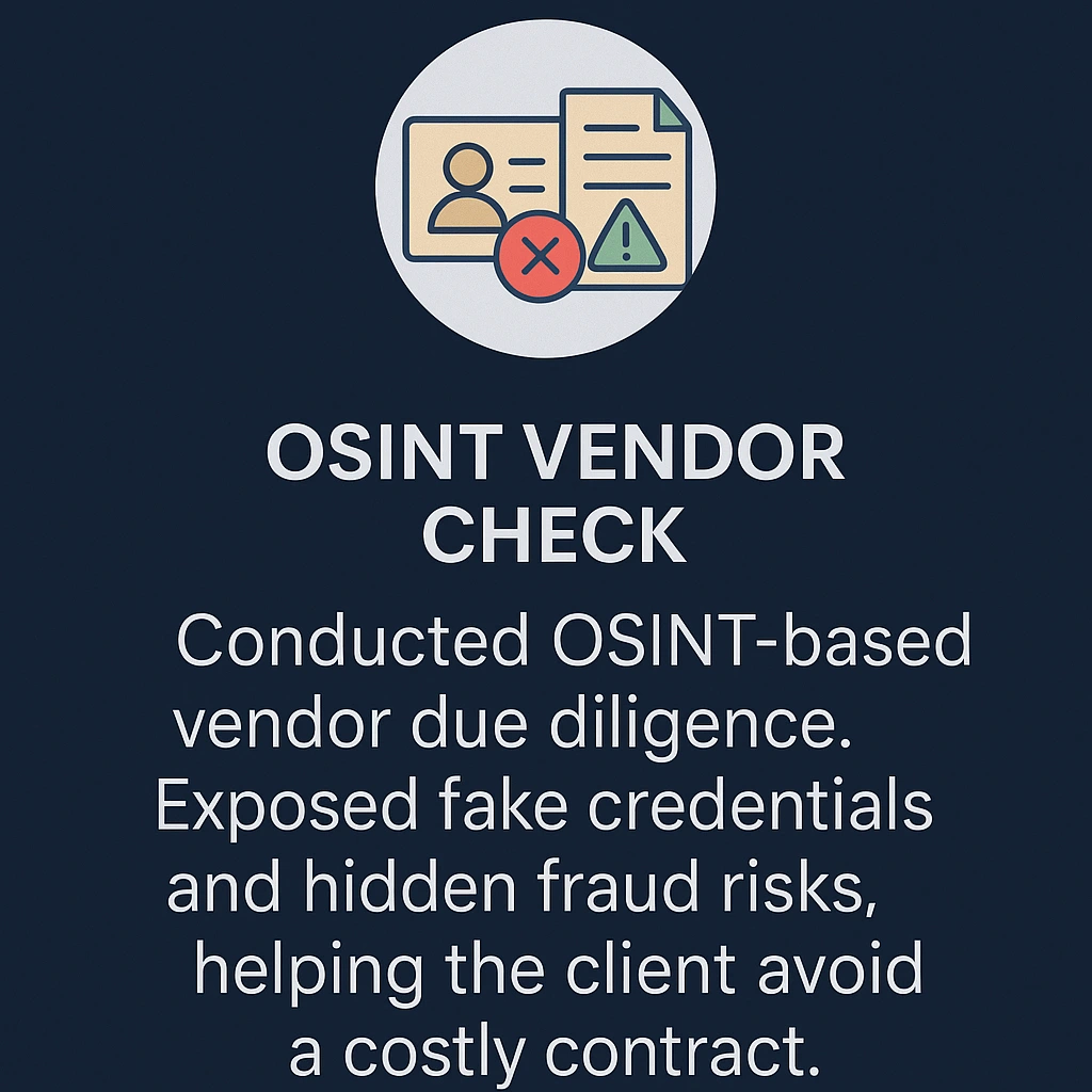 Conducted OSINT-based vendor due diligence. Exposed fake credentials and hidden fraud risks, helping the client avoid a costly contract.