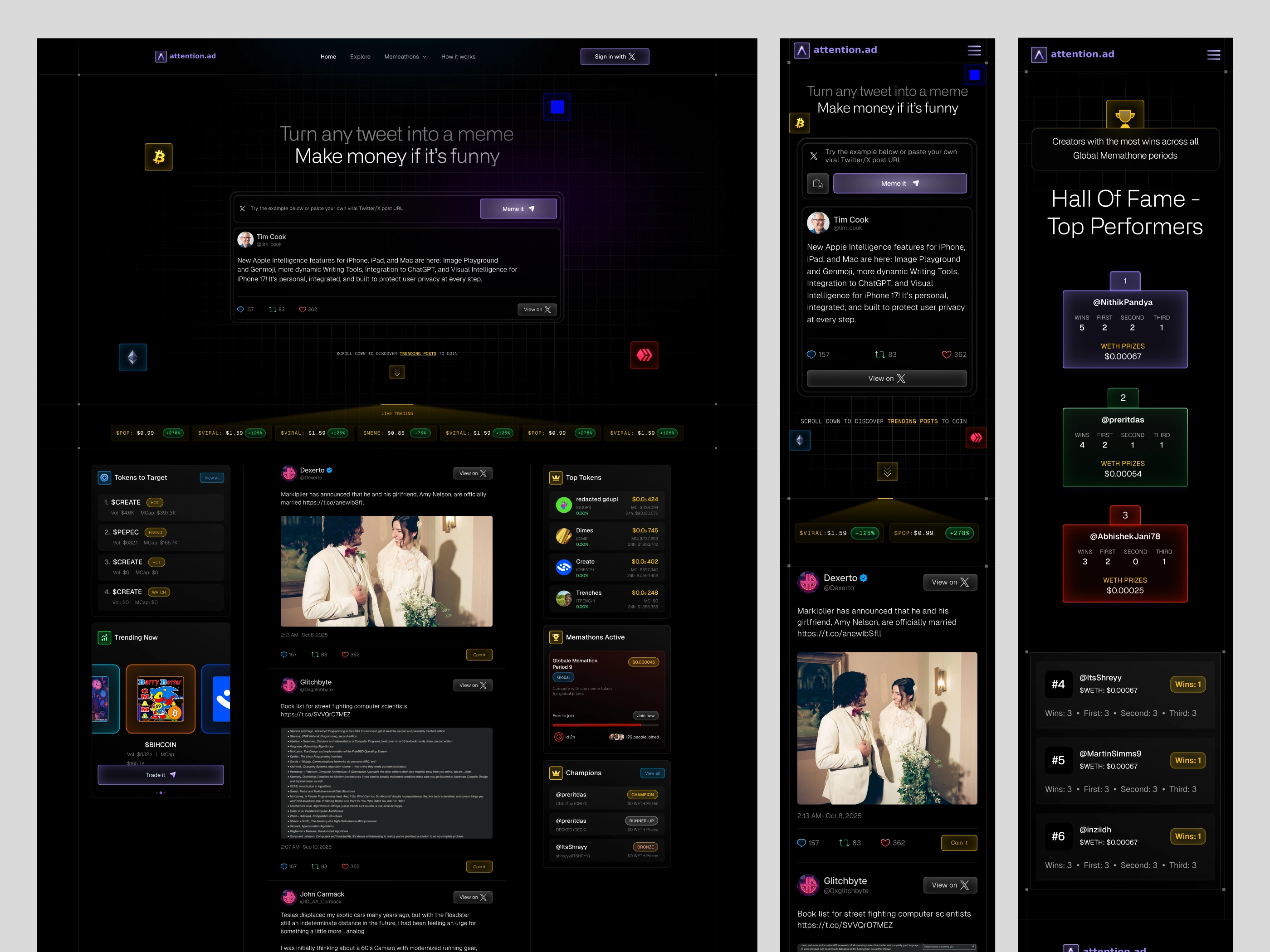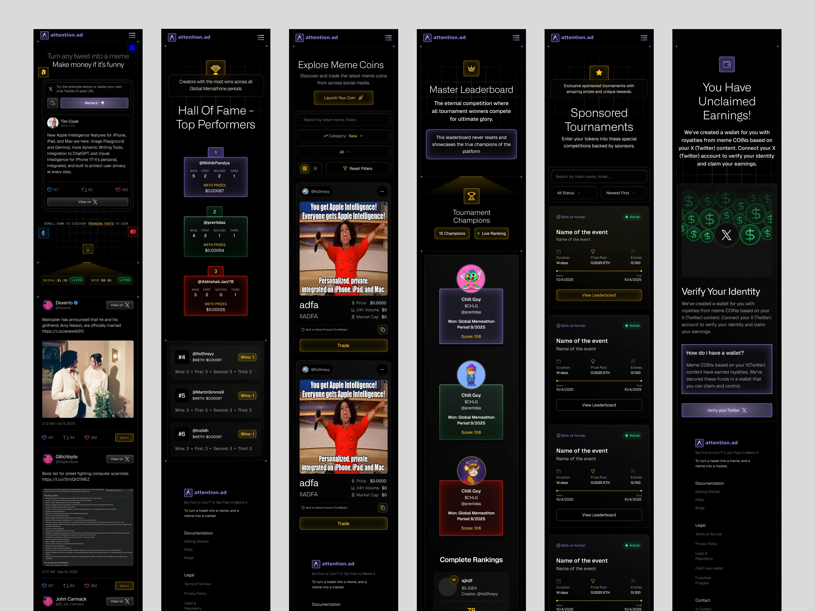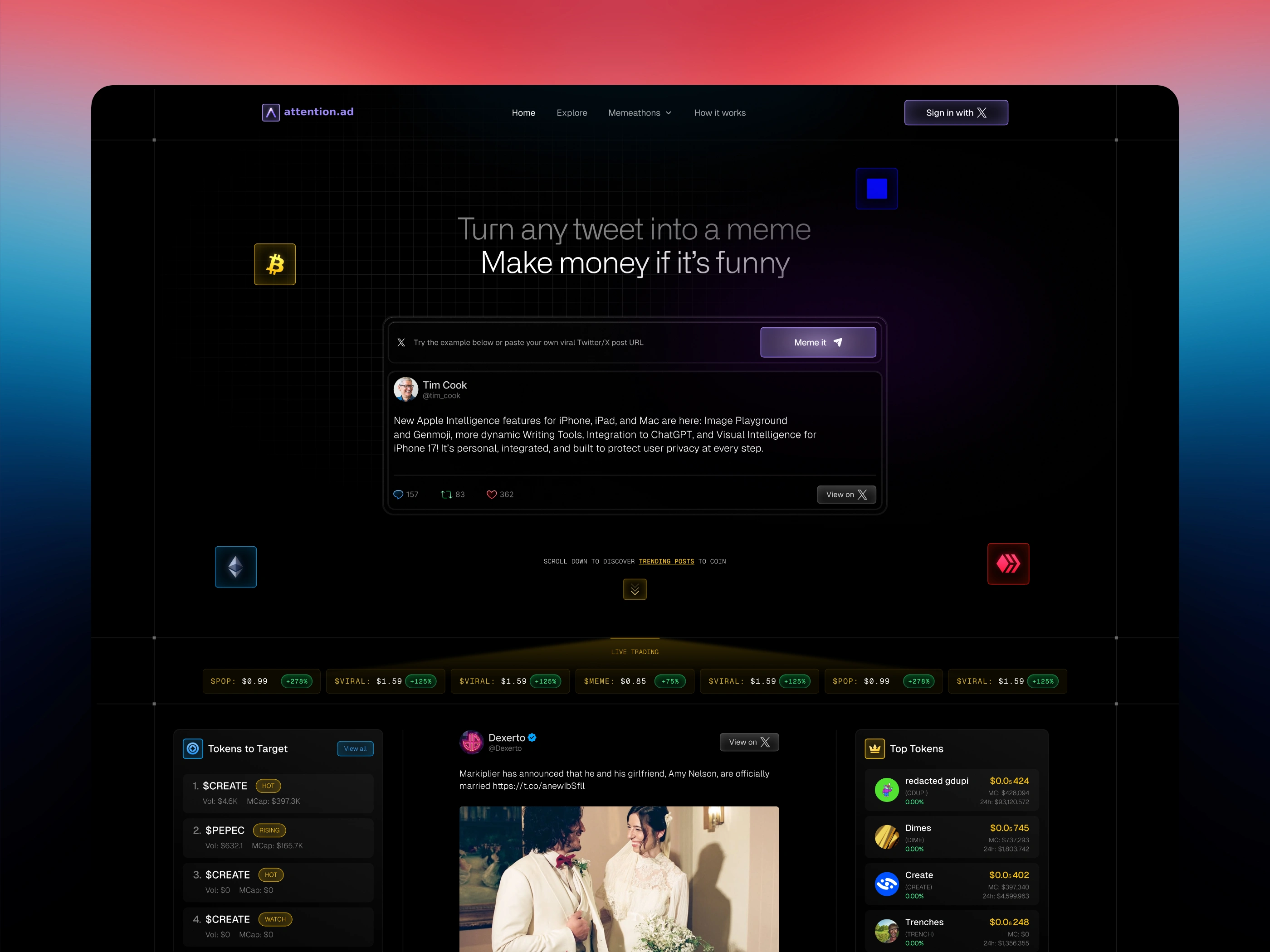Attention.ad is a culture-first platform built around one simple idea: turn attention into value. With the tagline “Be First to Coin™ It. Get Paid to Meme It.”, the product enables users to turn tweets into memes and earn money when those memes perform.
