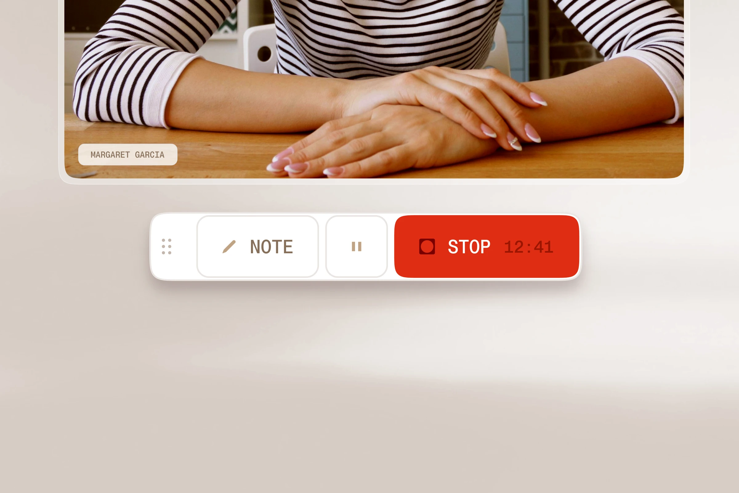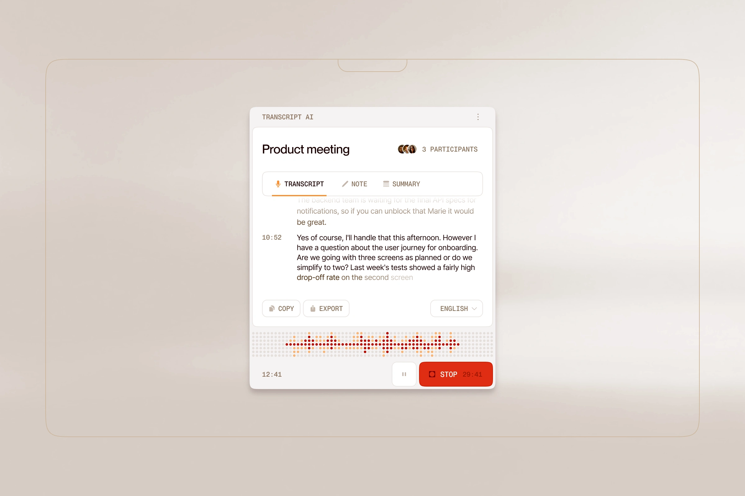 A clean UI concept for an AI-powered meeting transcription tool. Real-time transcript, participant view, waveform visualization, and quick note-taking — all in one minimal interface.
