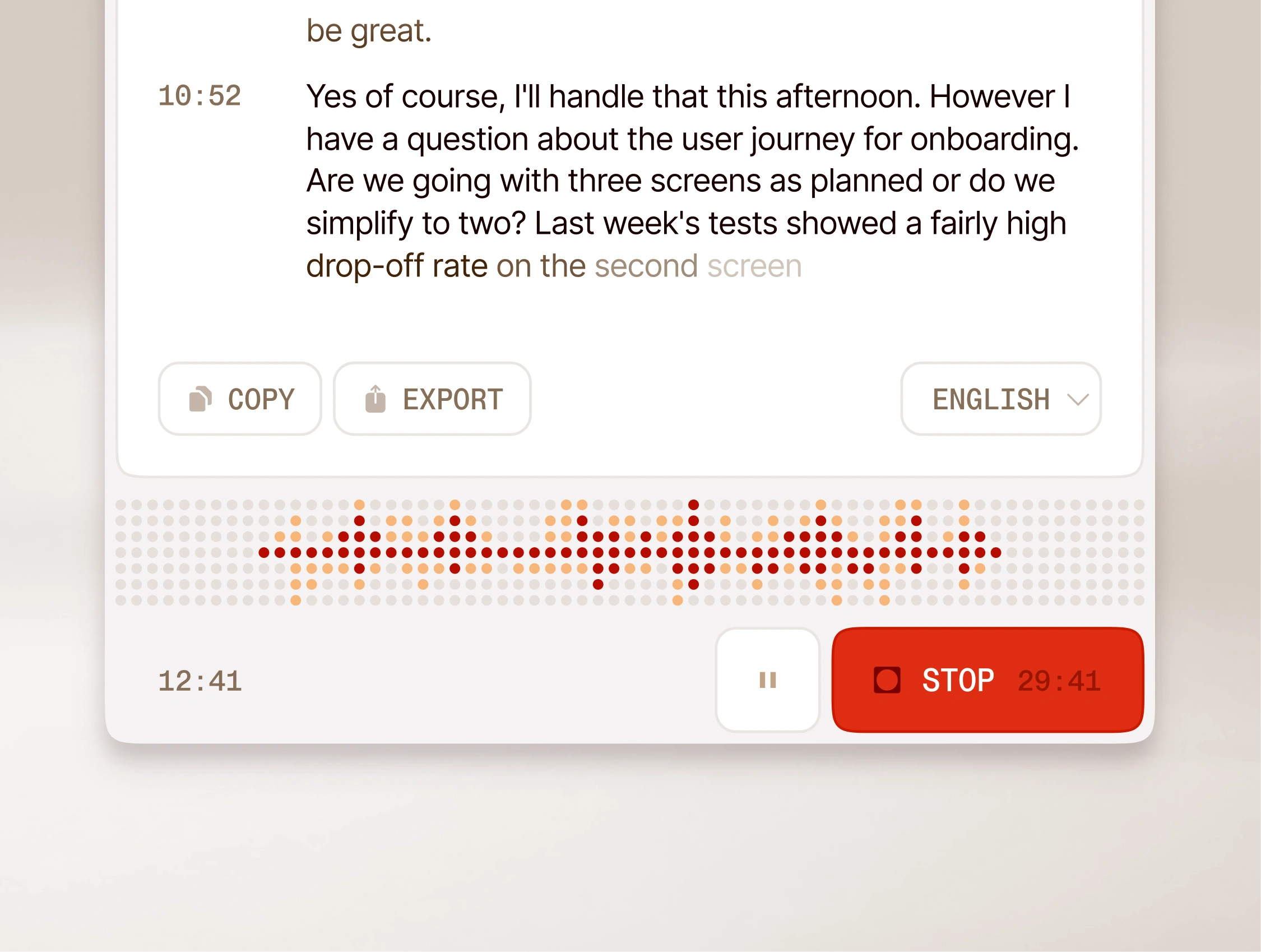 A clean UI concept for an AI-powered meeting transcription tool. Real-time transcript, participant view, waveform visualization, and quick note-taking.