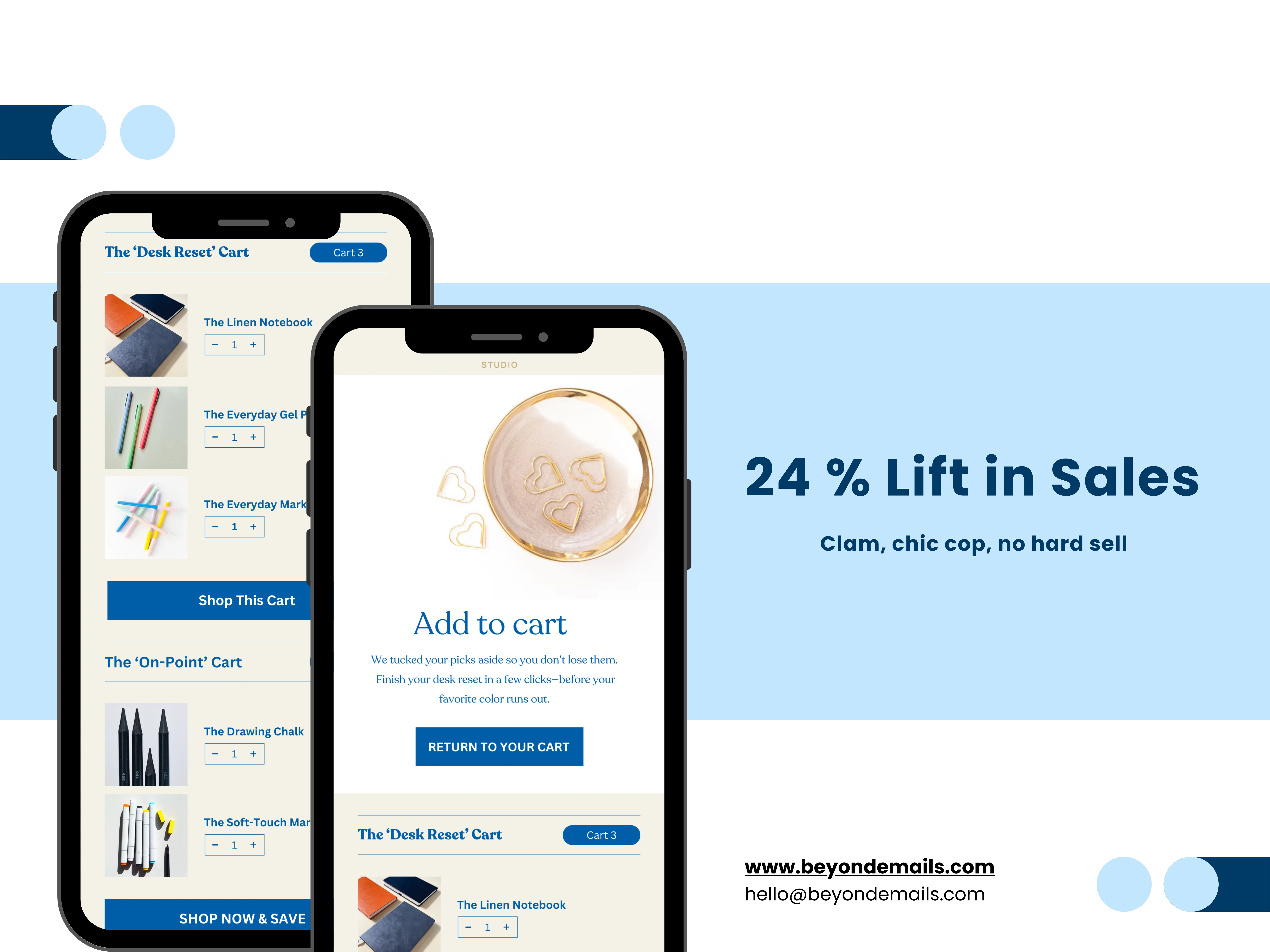 Cart emails weren’t converting: mismatched tone, one-size CTA, and no clear reason to complete the set. Mobile readability and trust cues were also light.