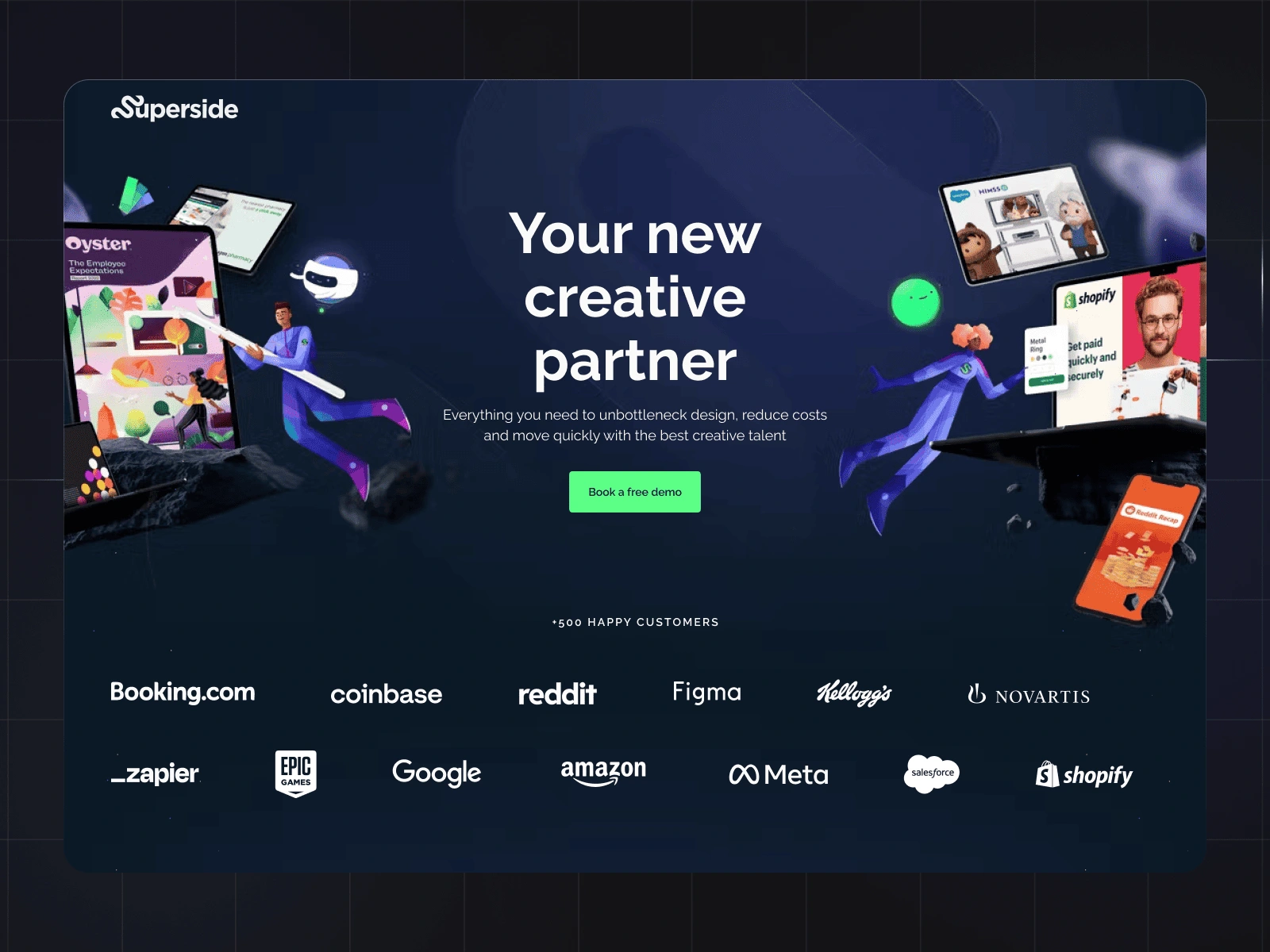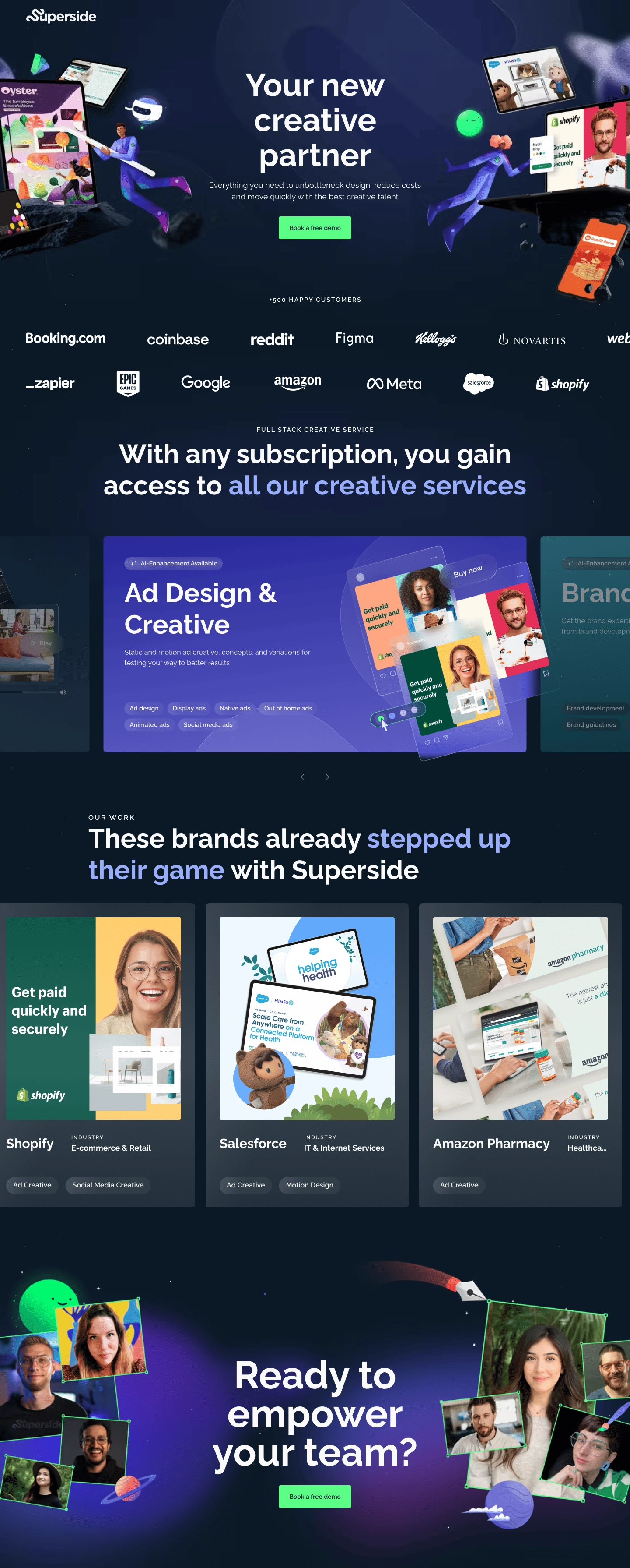 Landing page for Superside, showcasing subscription-based creative services for global brands.