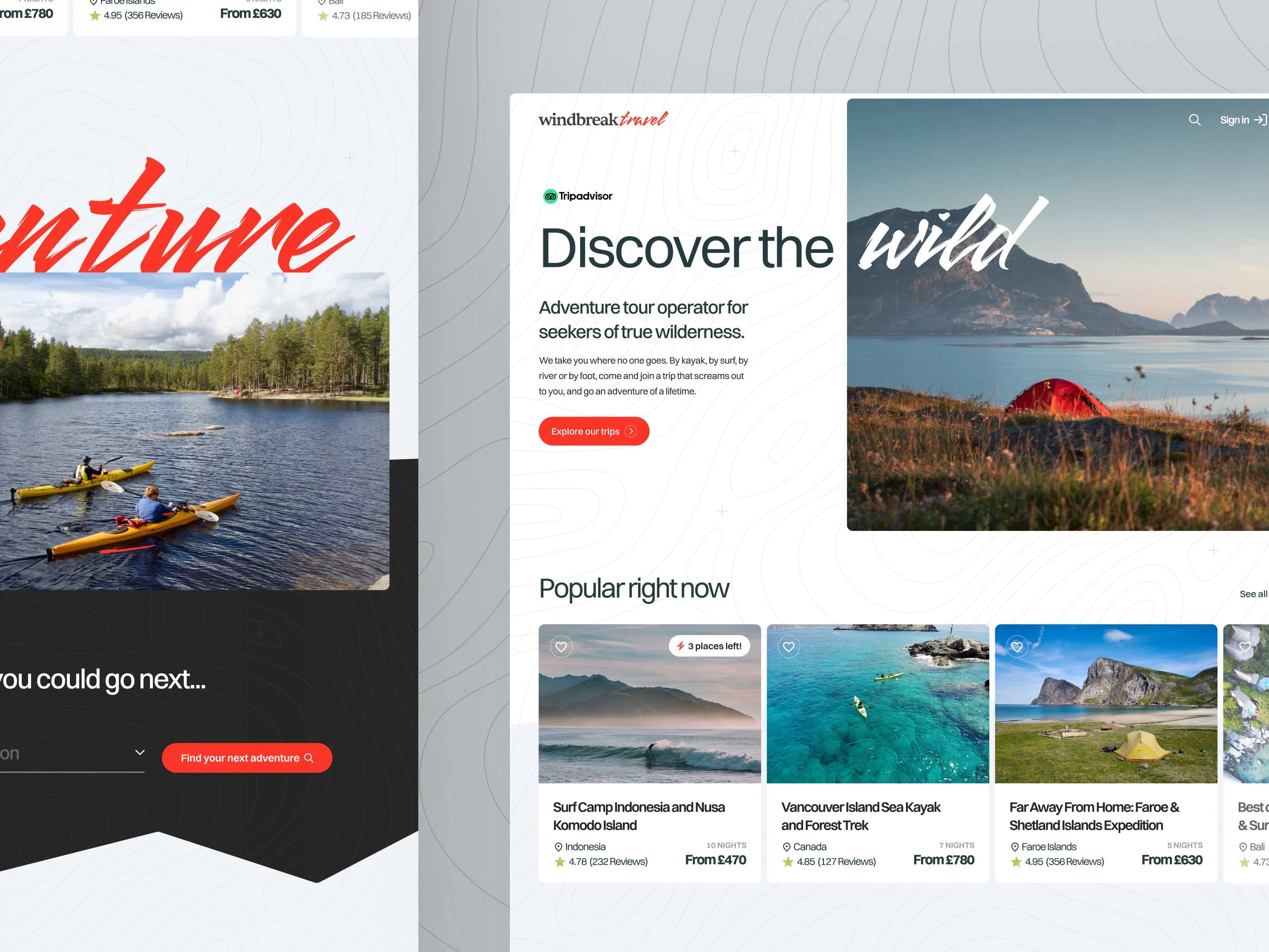 A visual design concept for Windbreak Travel, an adventure company who specialise in small group tours and expeditions for thrill seekers and outdoor enthusiasts in remote locations, such as the Faroe & Shetland Islands, Norway, Indonesia, Canada and Oceania.