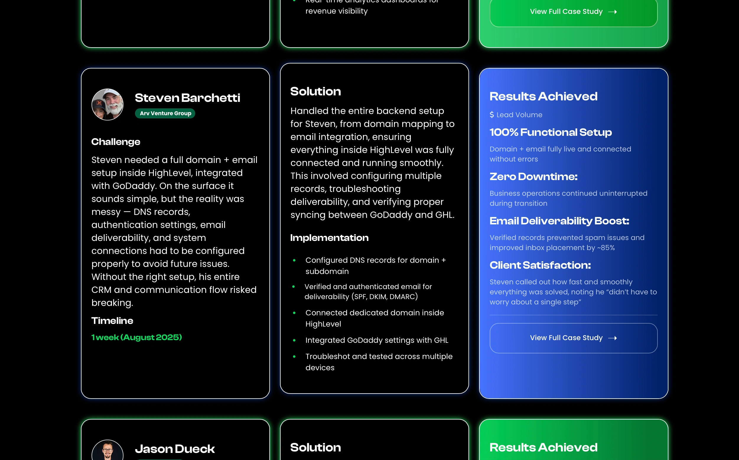 Configured DNS, authentication, and domain setup in GoDaddy + HighLevel, boosting deliverability by 85% with zero downtime and 100% functional setup.