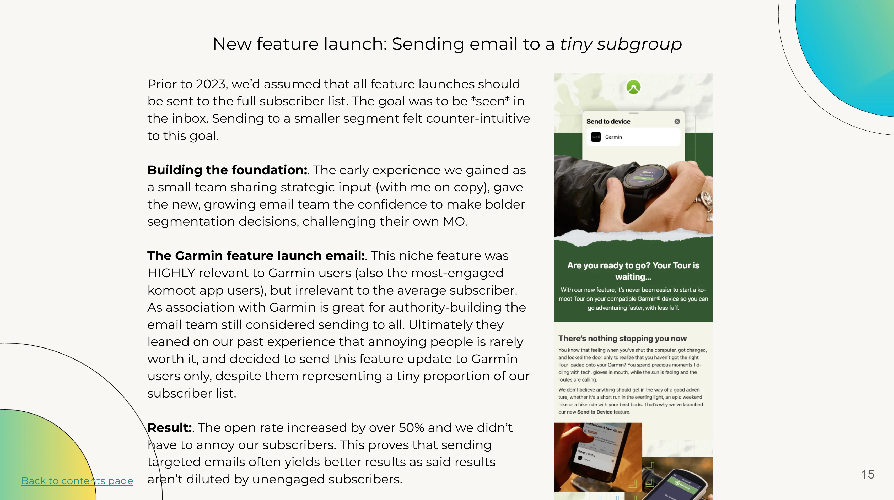 My first full time role at komoot was as a marketing copywriter. The content and communications team was small: Me, a designer, and the cofounder assigned the marketing function. In those days we were working from a clean slate and experimentation was the only way we progressed. The cofounder was busy wearing ten thousand hats, and the designer was busy…designing, so a lot of the project management and on-page messaging decisions fell to me. We all muddled through the strategy together. These are a few projects that helped build my understanding of email strategy from email copywriting (a skill in itself) to sophisticated targeting of different groups (segments) within our subscriber list.