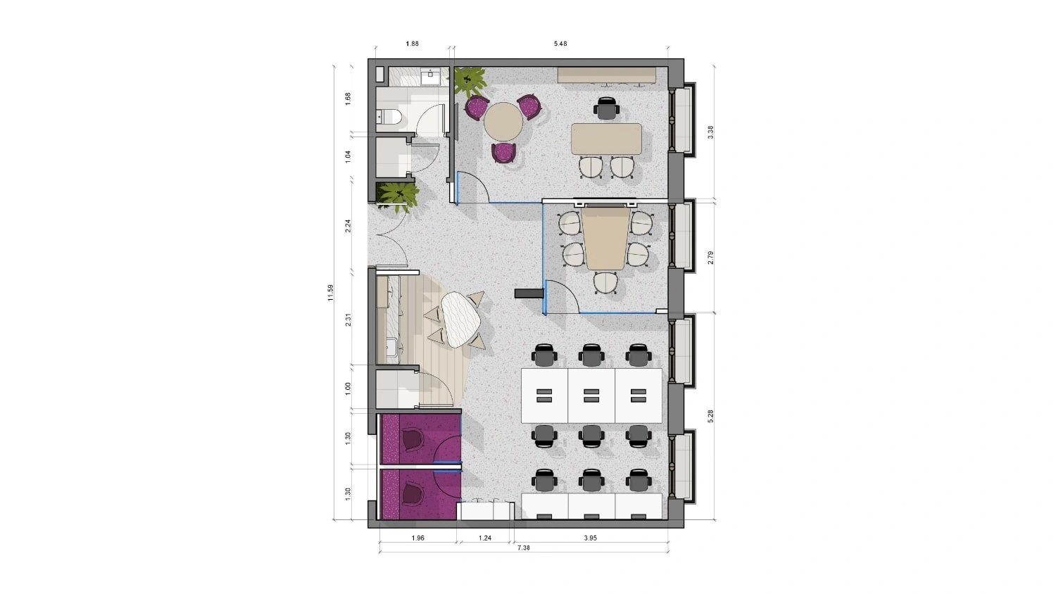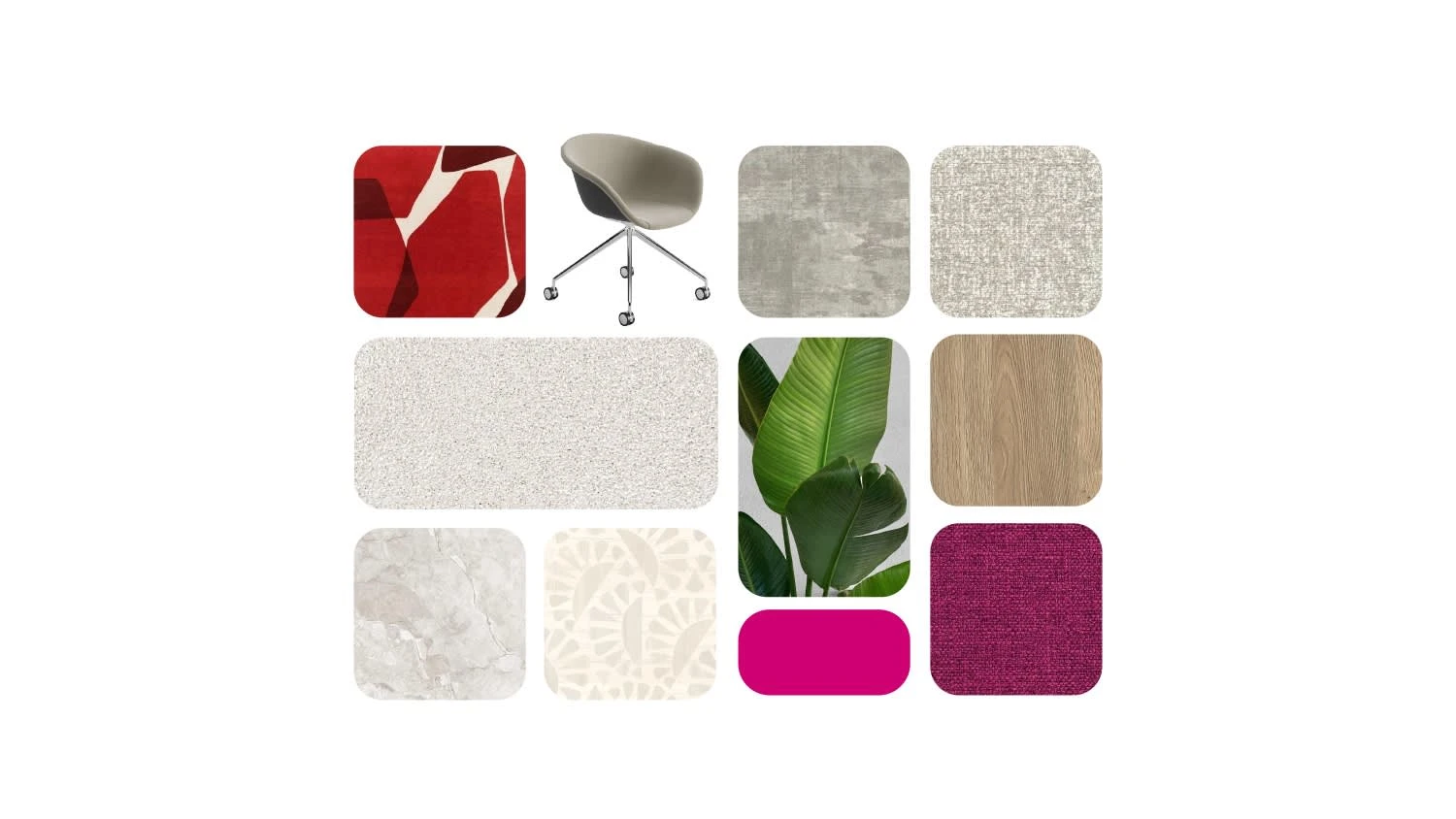 The interior design prioritizes light tones, the warmth of natural wood, and the use of magenta as a distinctive brand accent. Elements of biophilic design are incorporated to enhance employee wellbeing, while organic textures, sand-colored palettes, and noble materials add warmth and sophistication. The result is a modern space that integrates respectfully with its architectural context.