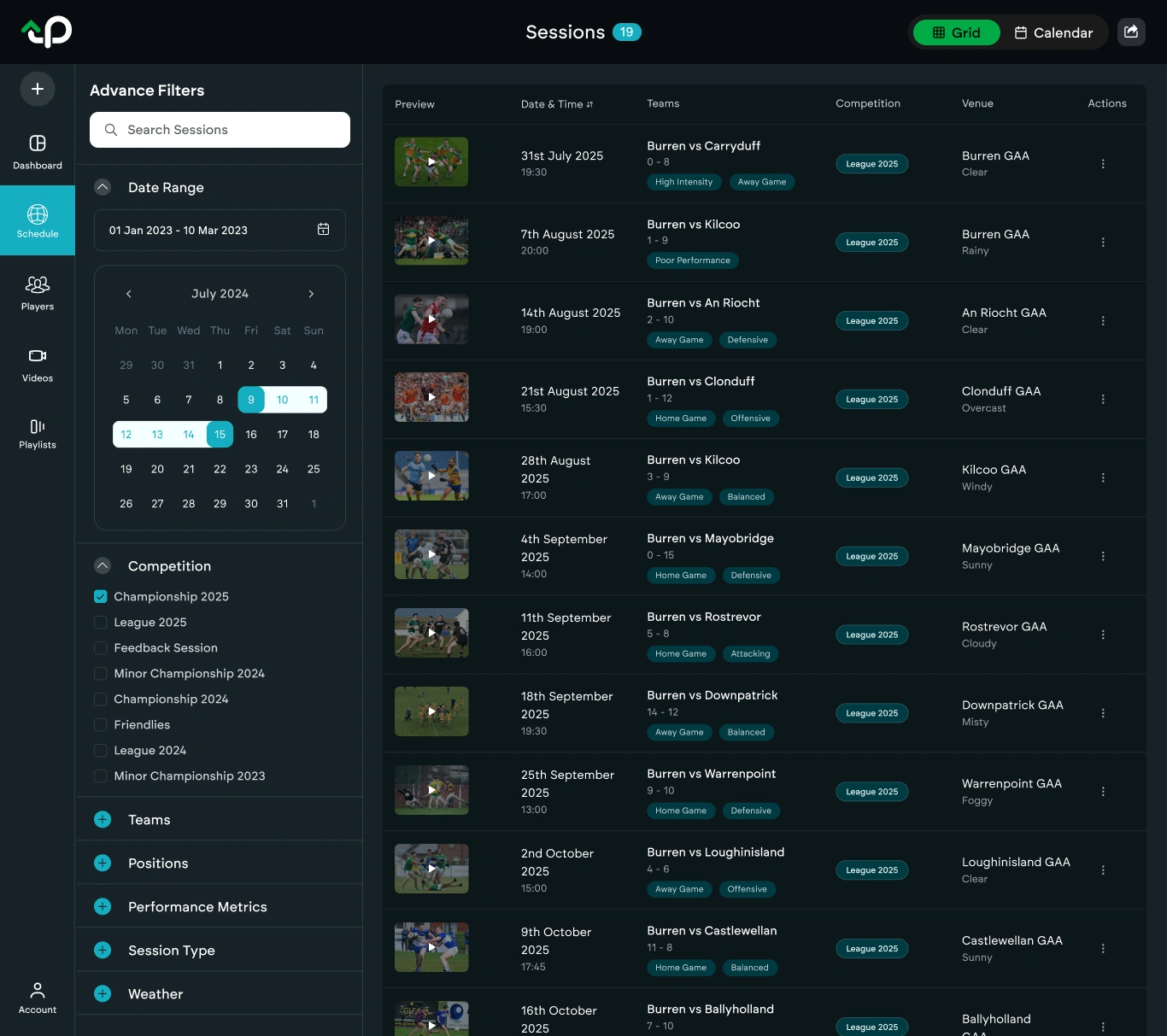 I designed the end-to-end UI for Performa, a sports analytics platform built for coaches and teams. My focus was seamless video analysis, powerful event tagging, and intuitive session management. The platform features game video breakdowns, timeline-based event search, and advanced filters for quick insights. I crafted clean, dark-themed dashboards for browsing matches, managing playlists, and reviewing team stats—all optimized for fast decision-making and easy navigation. The result: a modern, pro-level platform that transforms raw match footage into actionable, winning insights.