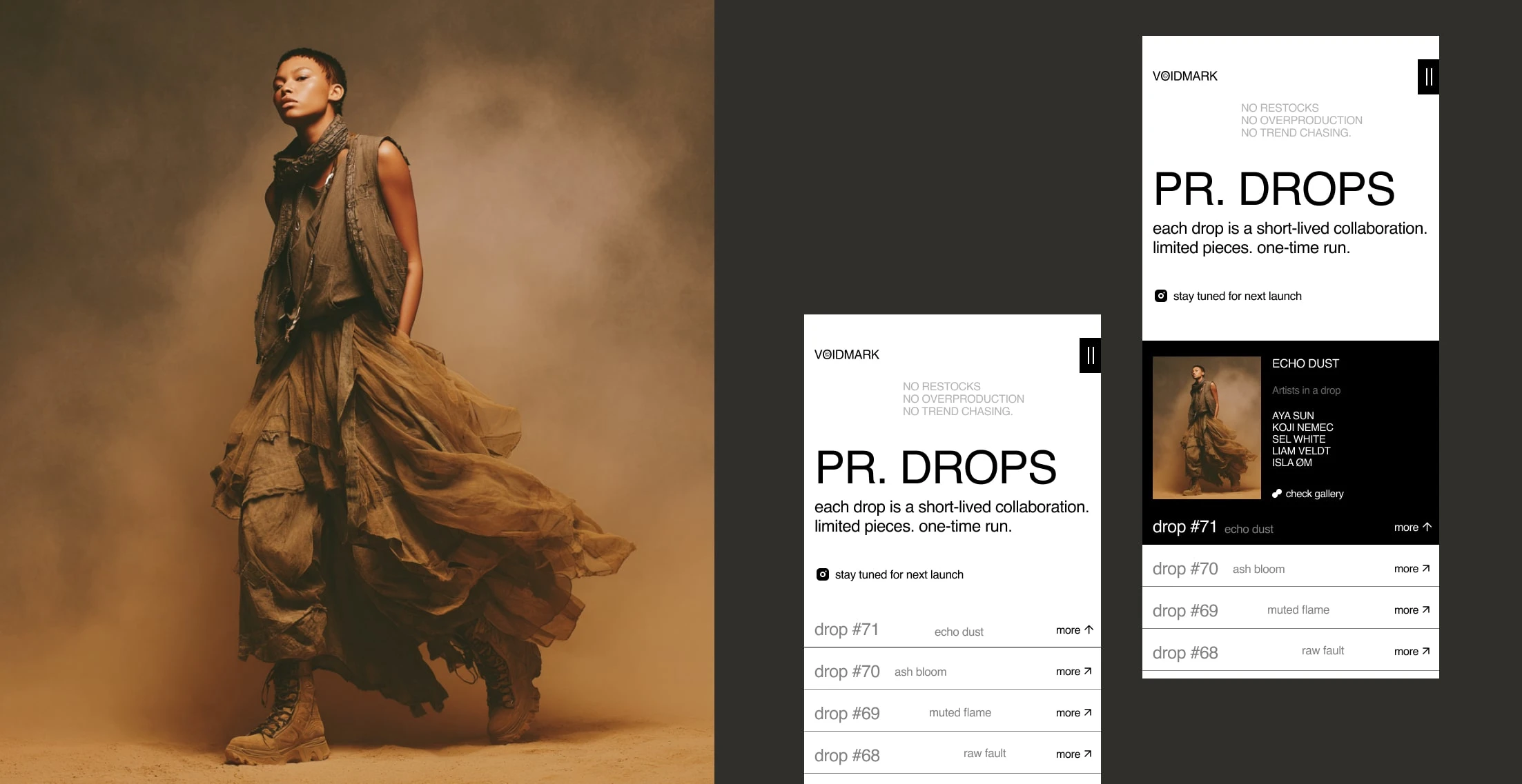 Design a mobile-first eCommerce experience for limited drops. The interface needed to reflect the brand's aesthetic — stripped, atmospheric, grainy while staying intuitive and frictionless.