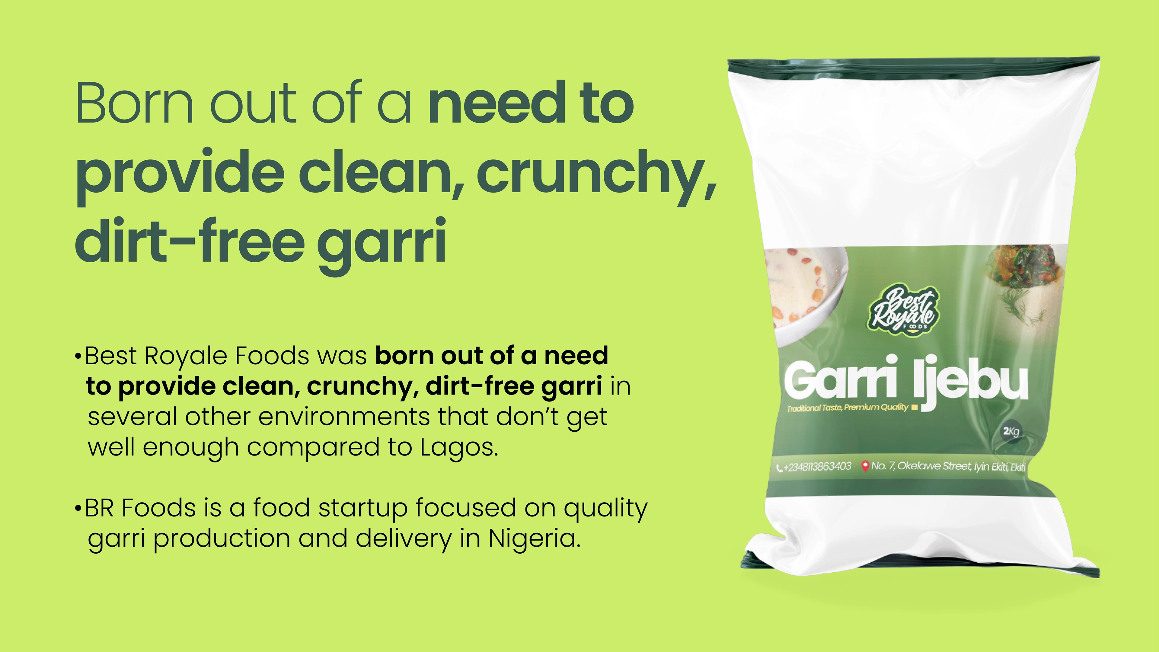 Best Royale Foods is a proudly Nigerian company committed to producing, processing, and packaging high-quality food products. Our range includes fresh palm oil, rice, Gaari, and butter. Driven by a passion for excellence, we prioritize customer satisfaction by delivering wholesome, affordable, and accessible food solutions.