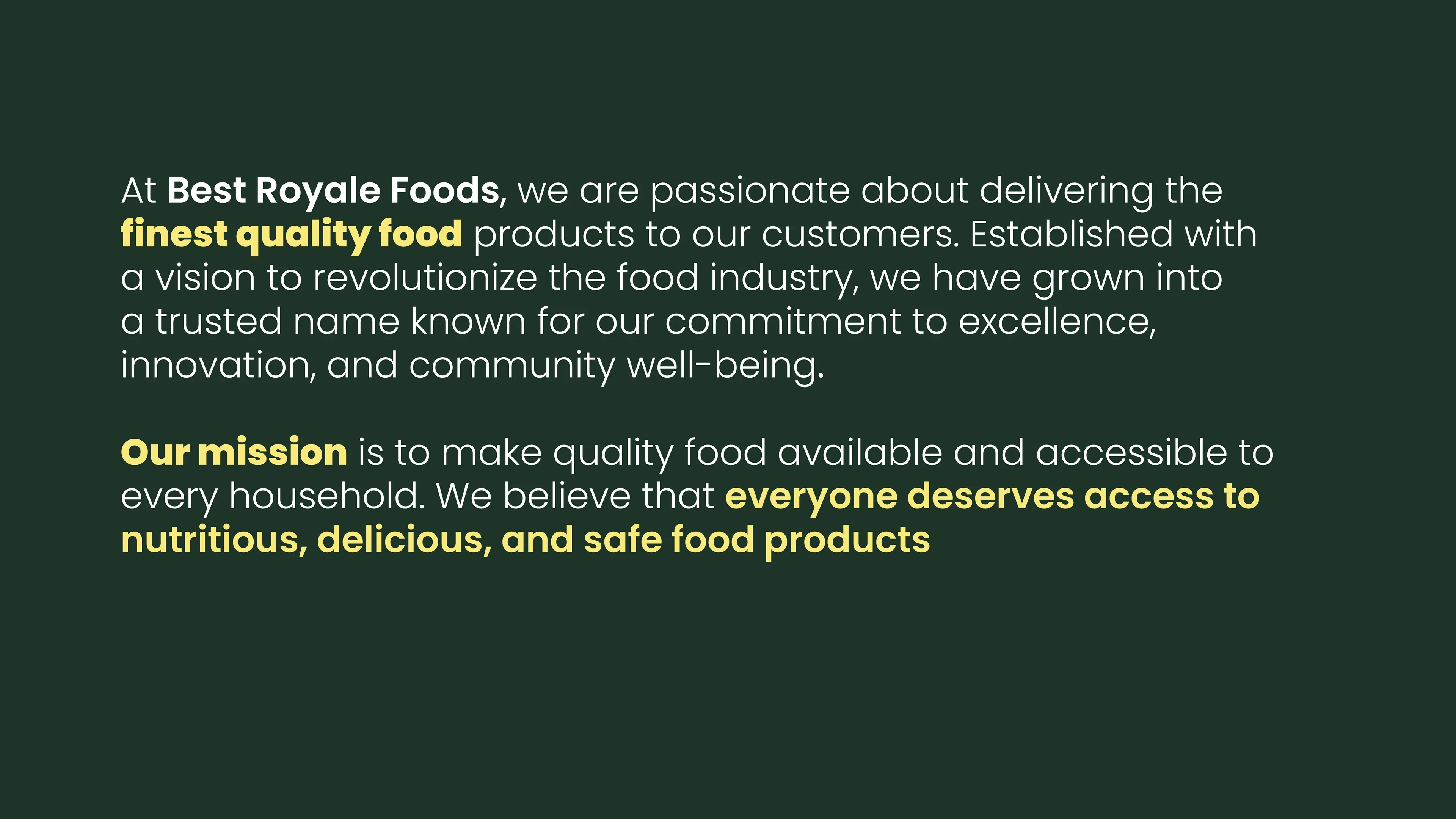 Best Royale Foods communicates with a tone of warmth, sincerity, and passion for excellence. Its messaging is designed to be approachable, customer-centric, and uplifting, reinforcing a commitment to providing delicious, high-quality food that brings happiness and nourishment to every family.