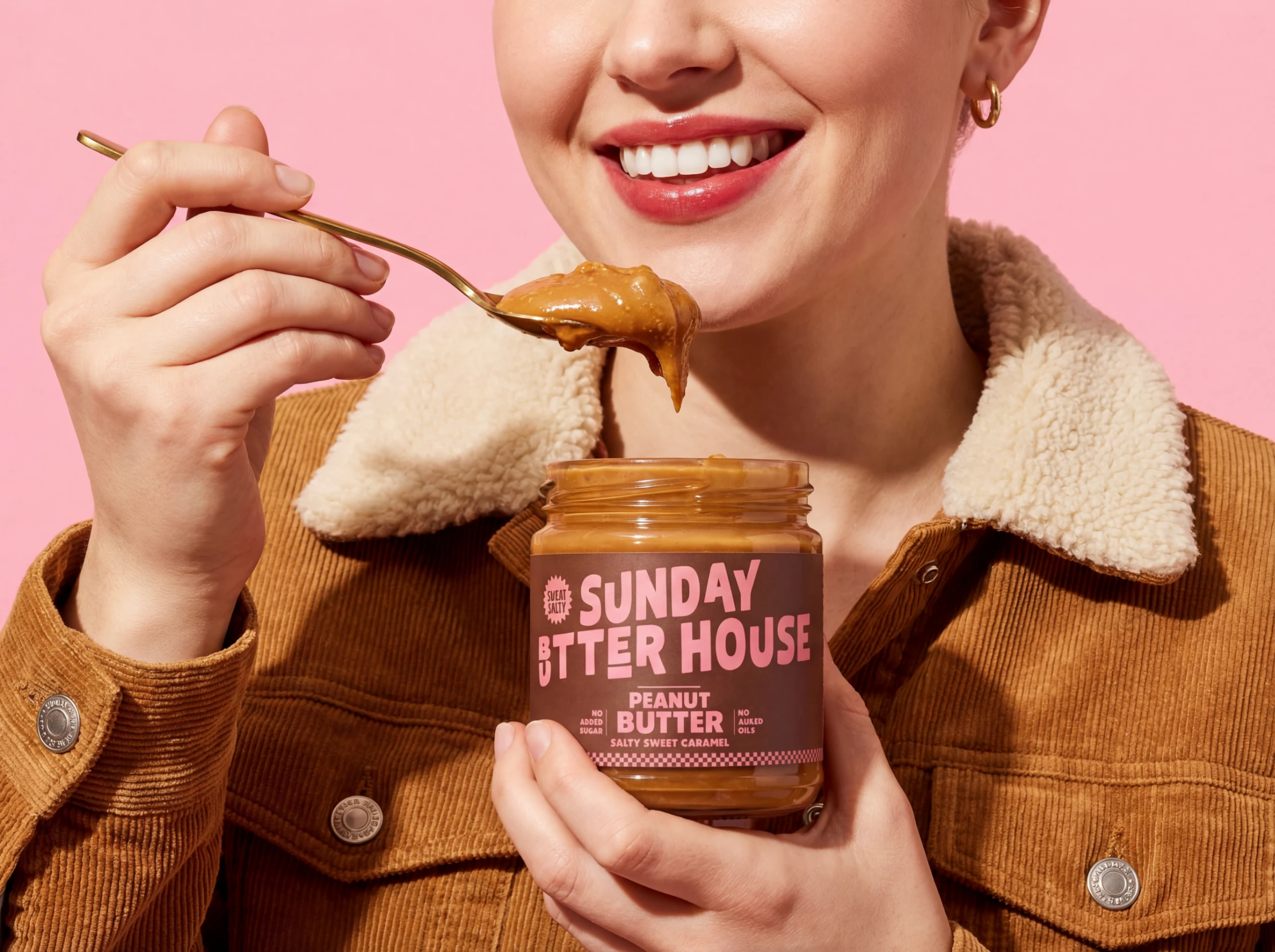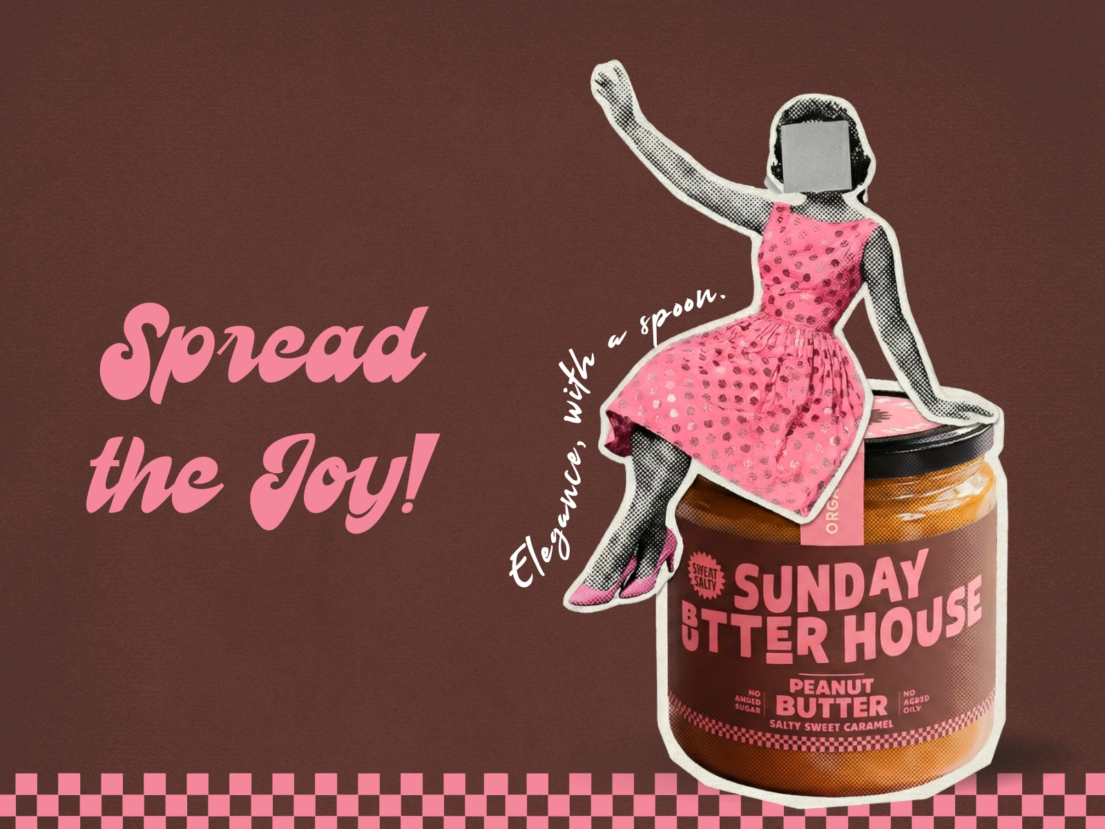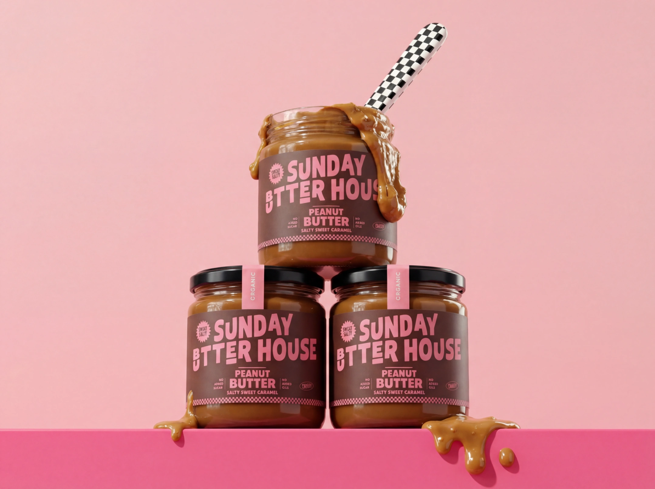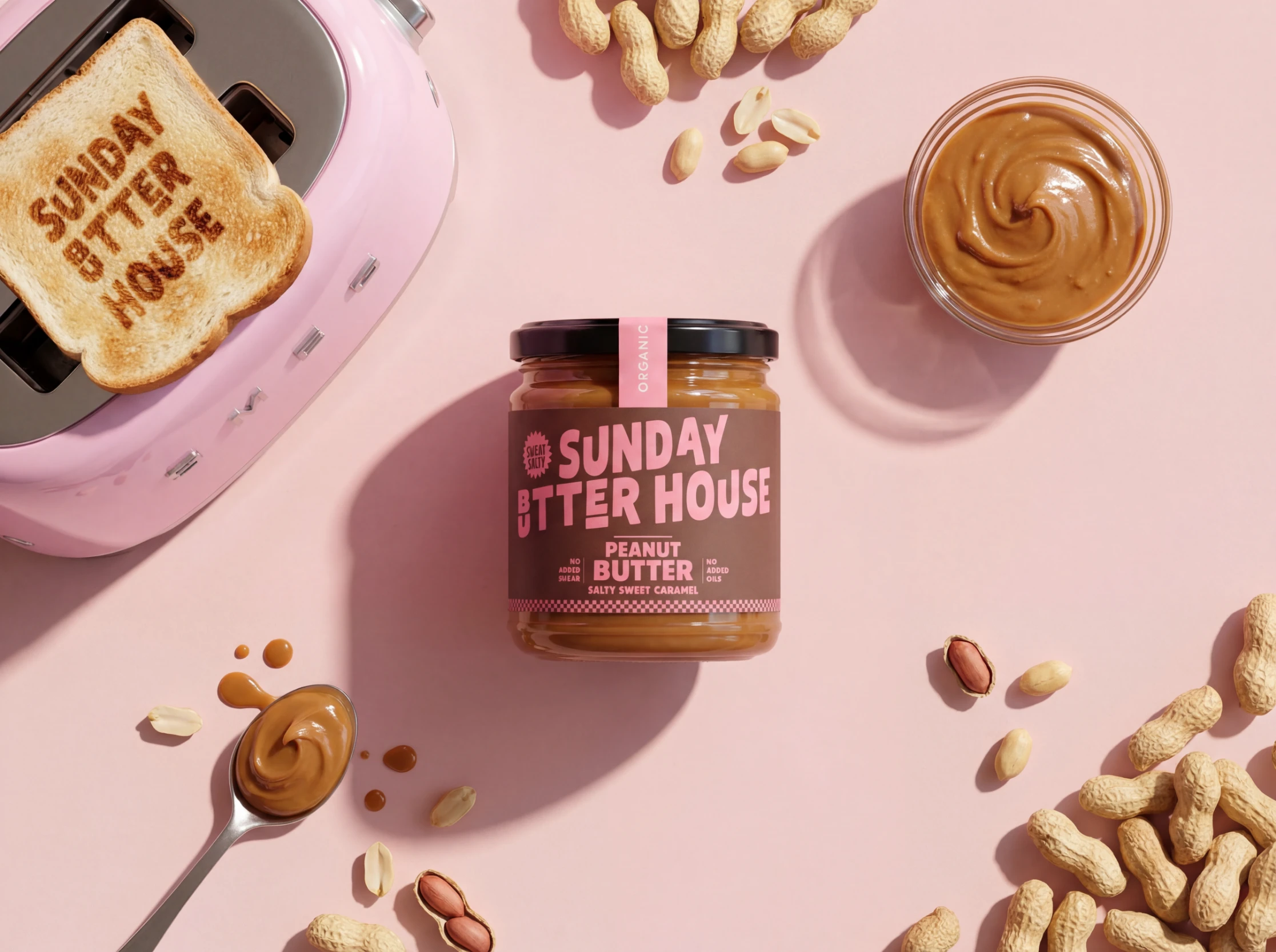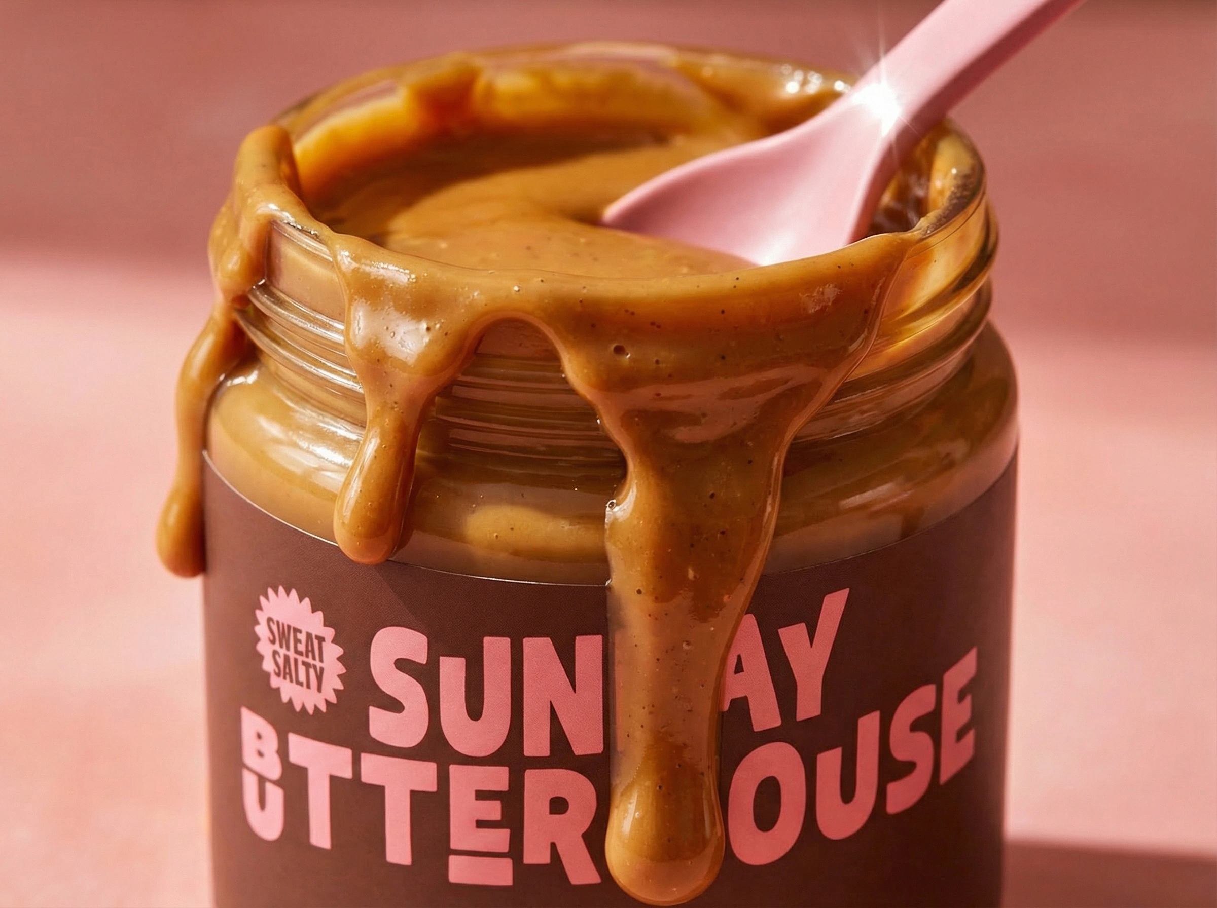 The pastel pink and deep brown palette nods to mid-century food styling, while the rich caramel tones of the spread add warmth and appetite appeal. The clear glass jar, bold black lid, and reverse-color tamper seal create contrast and structure, reinforcing a premium yet comforting presence.