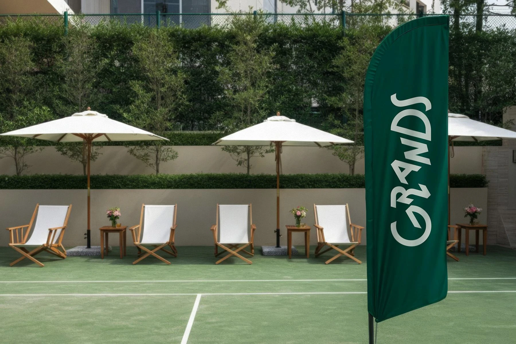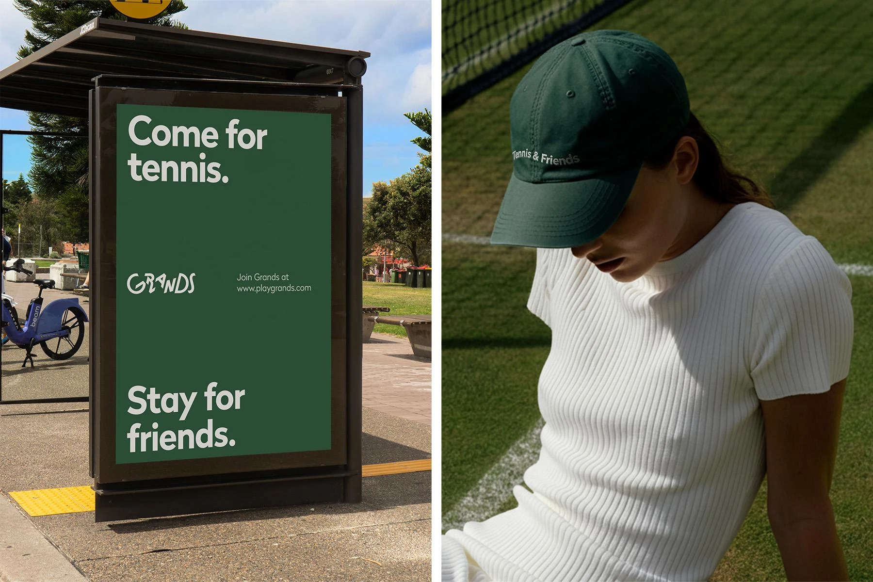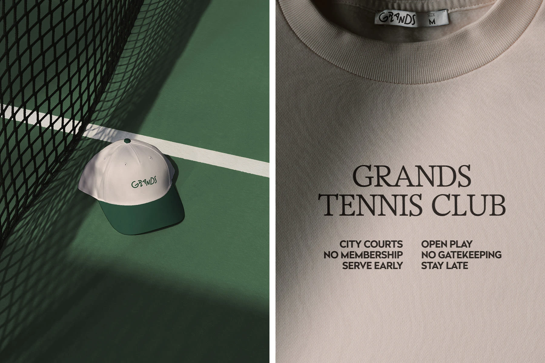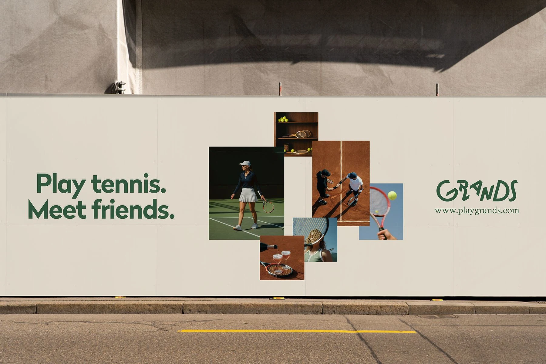 The Grands logo breaks away from the traditional tennis aesthetic with a playful, energetic wordmark full of motion. Each letter has its own posture, giving the mark a dynamic, rhythmic character like players mid-match, each with a distinct stance but moving as one team.