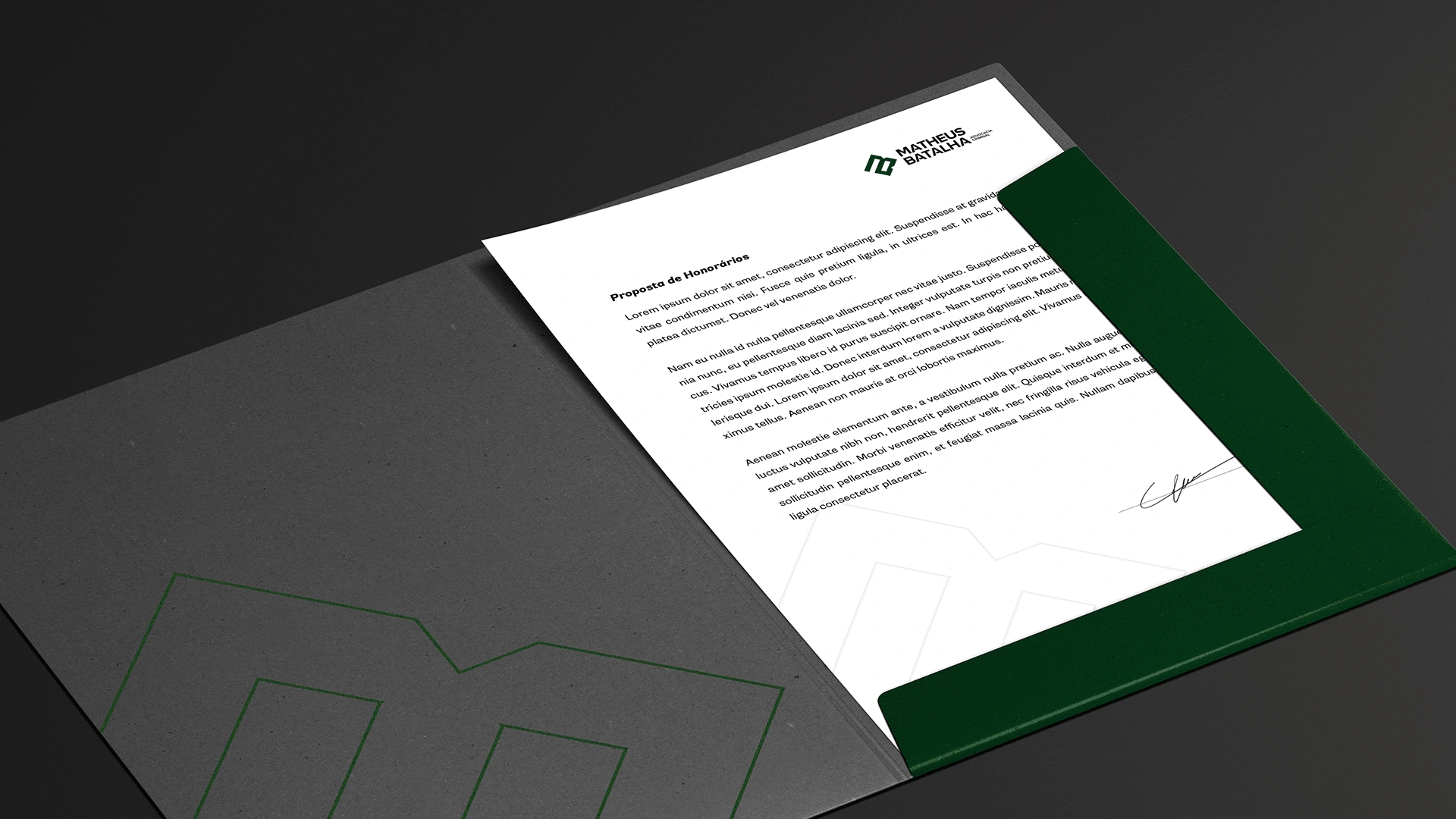 The logo symbol is a fusion of the initials "M" and "B," forming a stylized diagonal "B" that conveys robustness and professionalism, essential in criminal law. Its design allows for a dual reading of the initials, reinforcing Matheus Batalha's identity, while the diagonal tilt conveys dynamism and adaptability. This combination reflects strength, innovation, and trust, creating a modern and impactful brand.