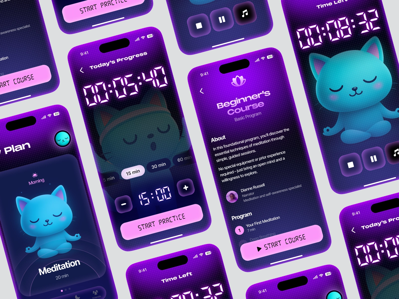 The client approached me with a vision to create a meditation app that feels personal, comforting, and memorable. Instead of the typical minimal, abstract wellness aesthetic, they wanted a playful twist - a cat mascot that guides users through breathing exercises, mindfulness sessions, and daily emotional check-ins.