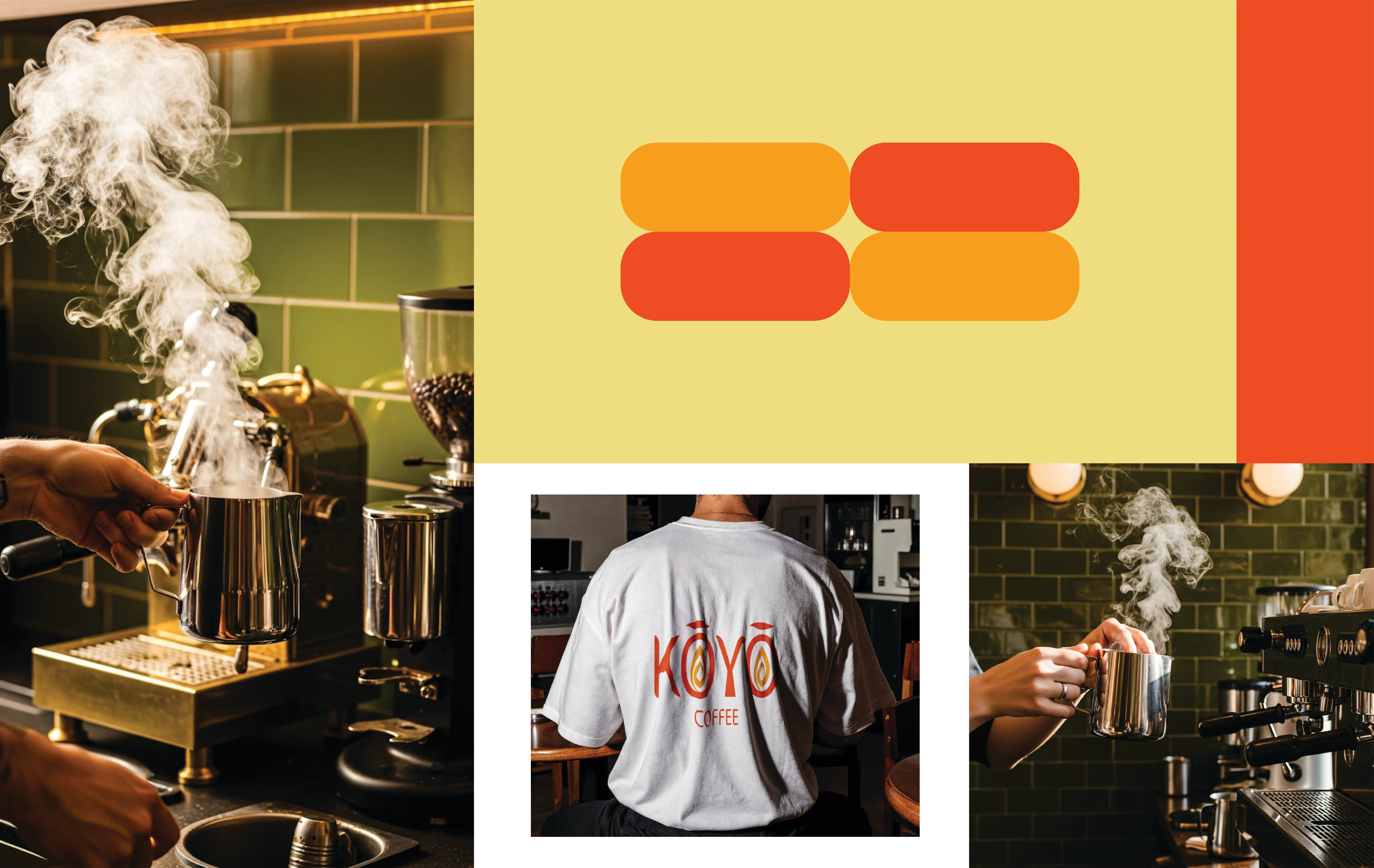 The KOYO Coffee logo is inspired by the Japanese word koyo, which means autumn leaves or autumn colors, which conveys a feeling of warmth, seasonality and comfort. Its vibrant orange color palette suggests positive energy and a cozy atmosphere, inviting customers to associate the cafe with a relaxing atmosphere. The symbols in the letters ’’O’’, which resemble both a leaf and a coffee bean, communicate the idea of freshness and naturalness. The design projects a friendly, warm and authentic brand image, oriented towards quality and pleasant customer experiences.
