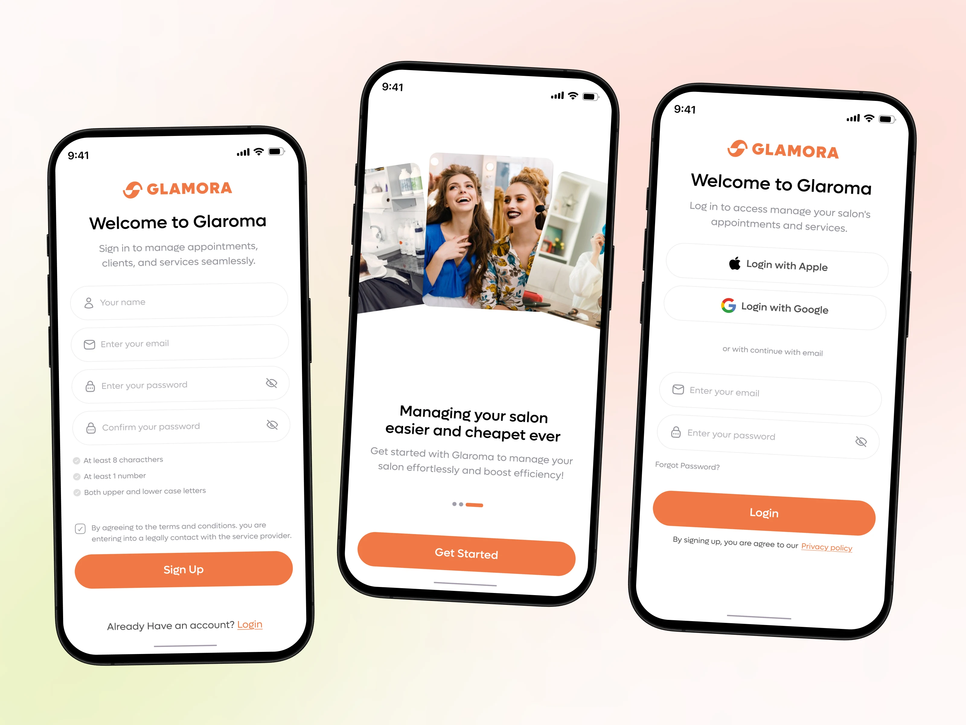 Presenting the onboarding, sign-up, and login screens for Glaroma, a modern barber salon mobile app designed to streamline salon bookings and enhance user experience. The onboarding flow introduces key features with clean, minimalistic visuals, while the authentication screens ensure a seamless and intuitive user journey. The design emphasizes accessibility, elegance, and functionality, tailored for a professional yet user-friendly vibe.