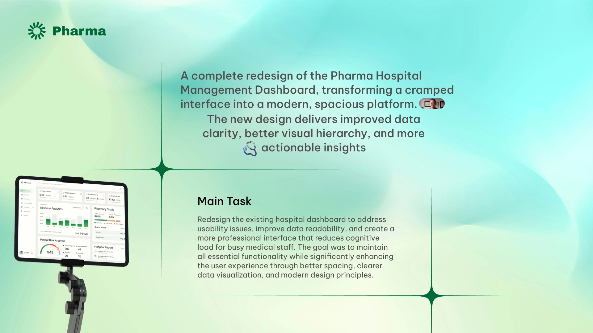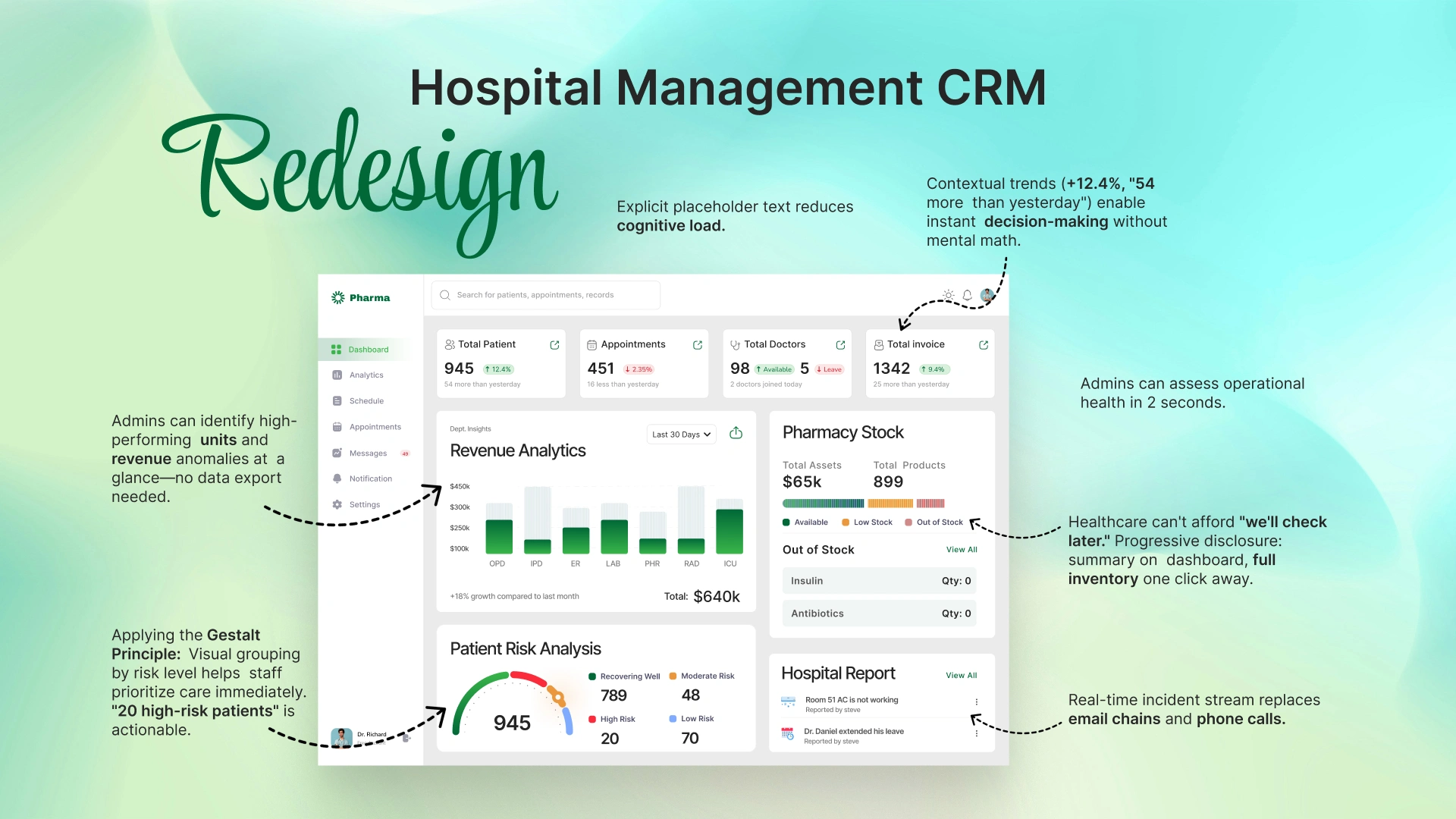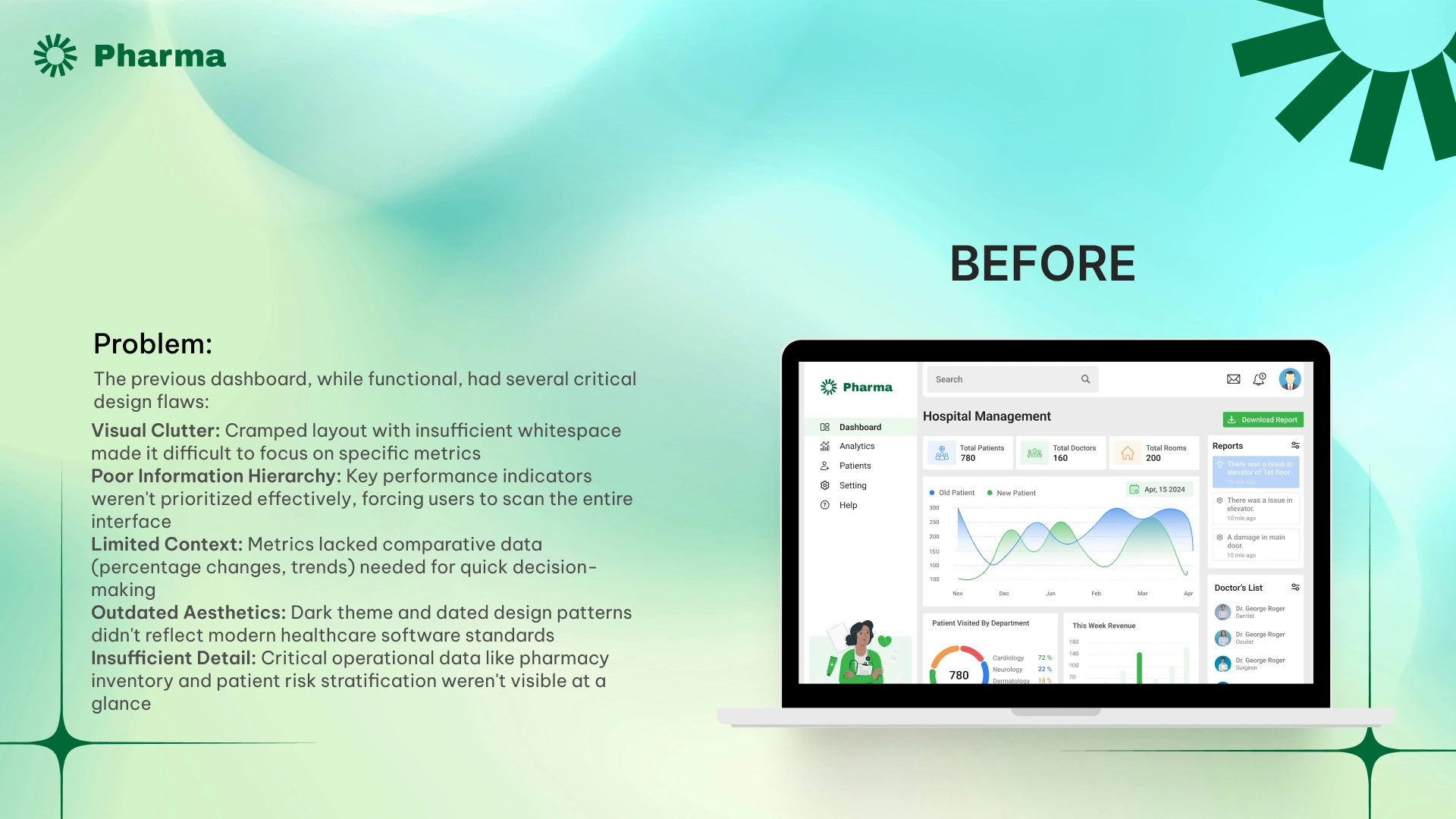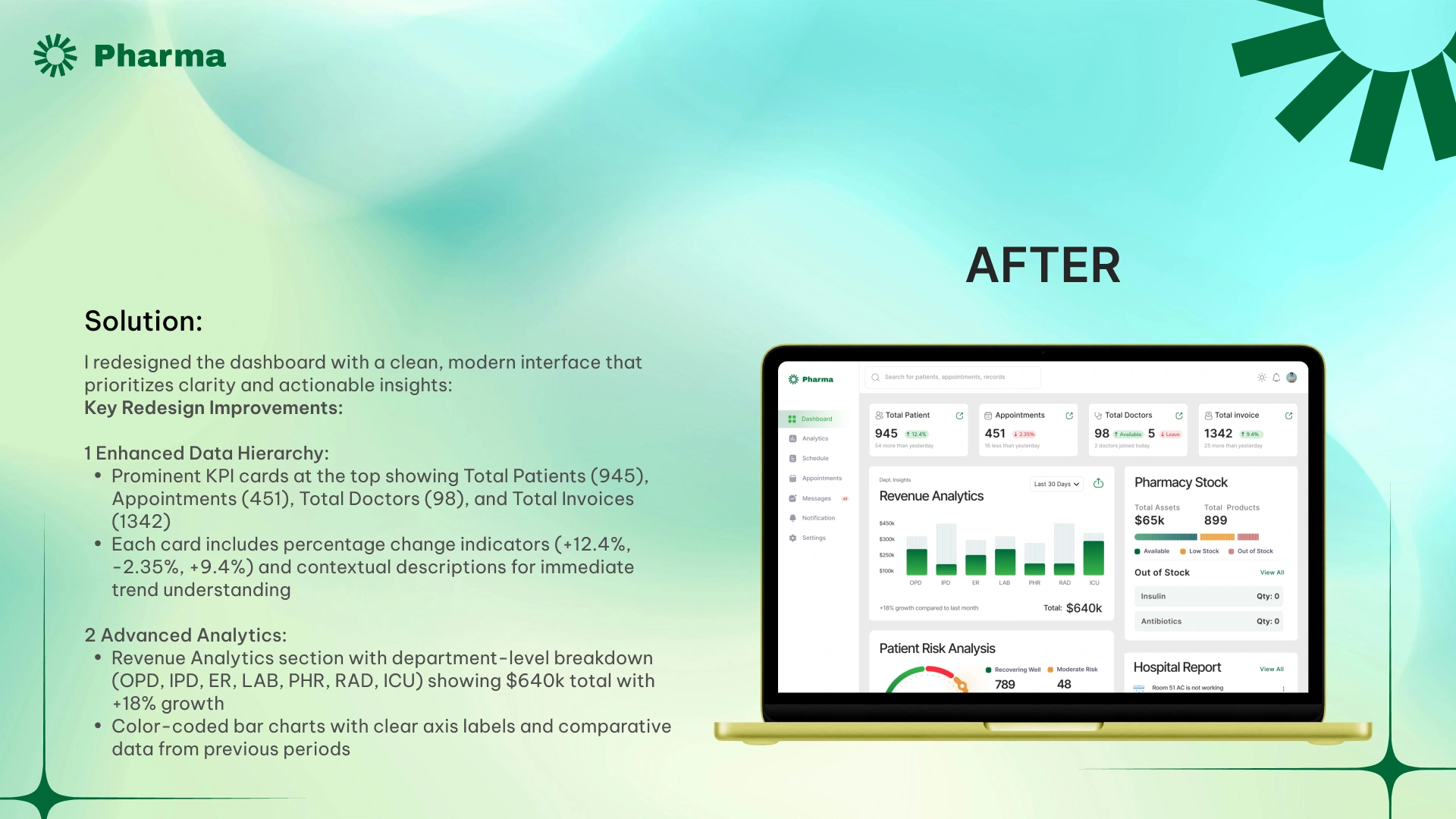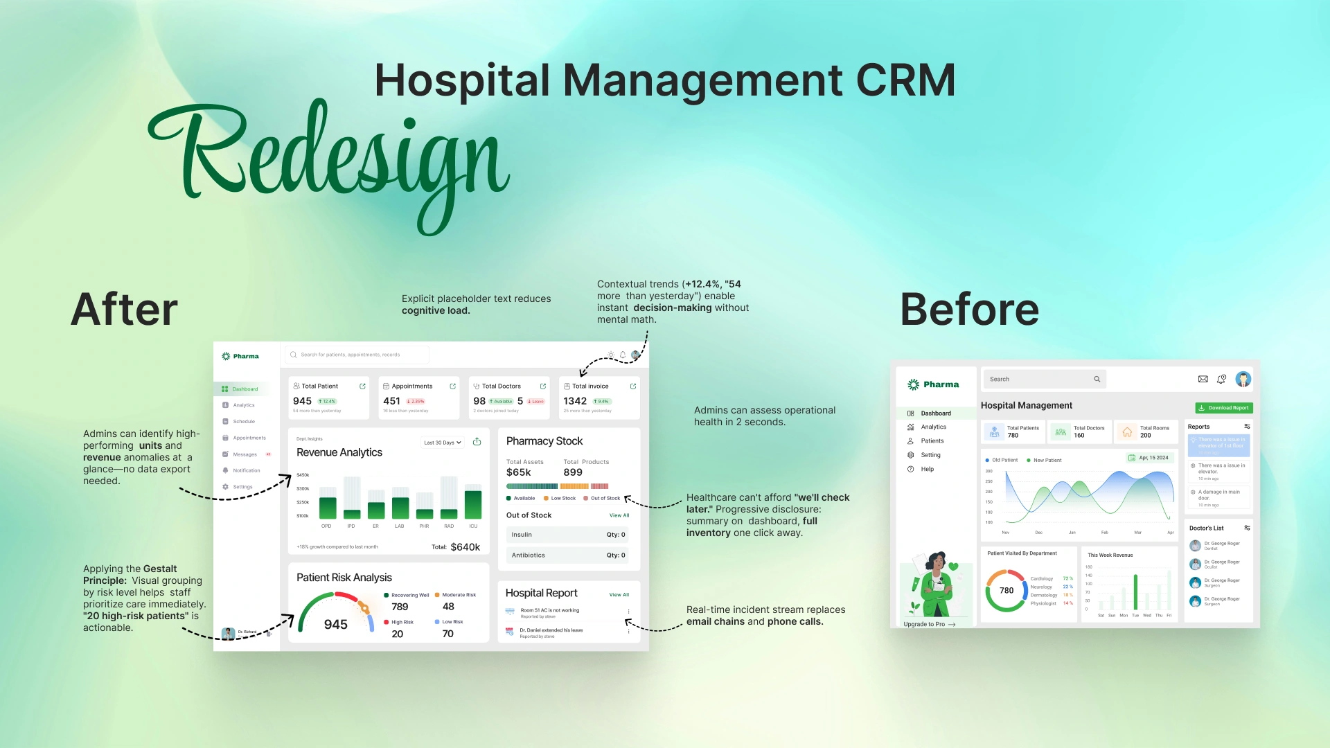 I redesigned a hospital management dashboard serving 780+ patients and 160 staff members. The original interface had poor visual hierarchy and cluttered data presentation, making it difficult for medical staff to find critical information quickly. I restructured the layout using Gestalt principles of proximity and grouping, creating distinct sections for patient metrics, revenue analytics, pharmacy stock, and incident reports. I introduced a Patient Risk Analysis module with color-coded urgency levels and improved data visualization with departmental performance charts.