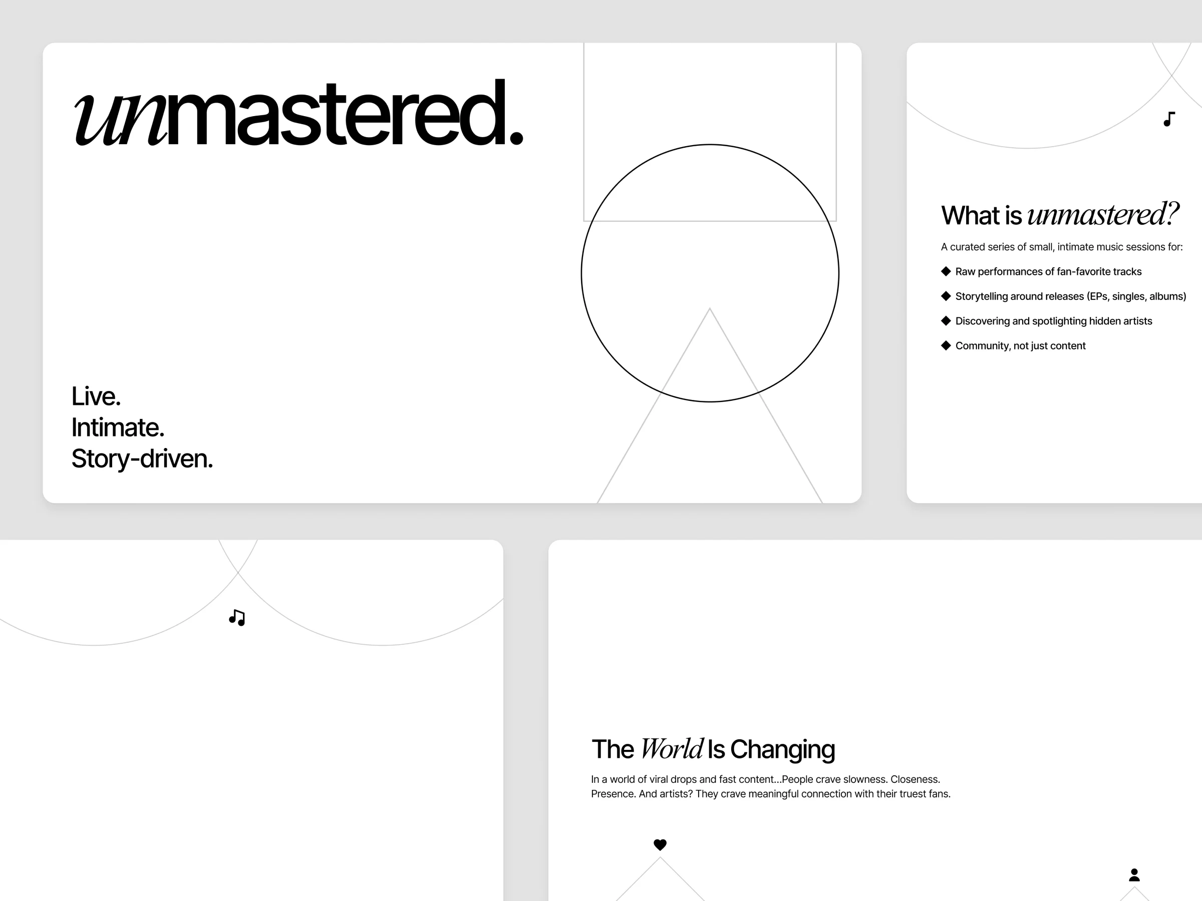 This deck was created to introduce Unmastered — a platform for intimate, story-driven music sessions spotlighting emerging and independent artists. The goal was to build a narrative around slowness, presence, and authenticity in an age of viral noise.
