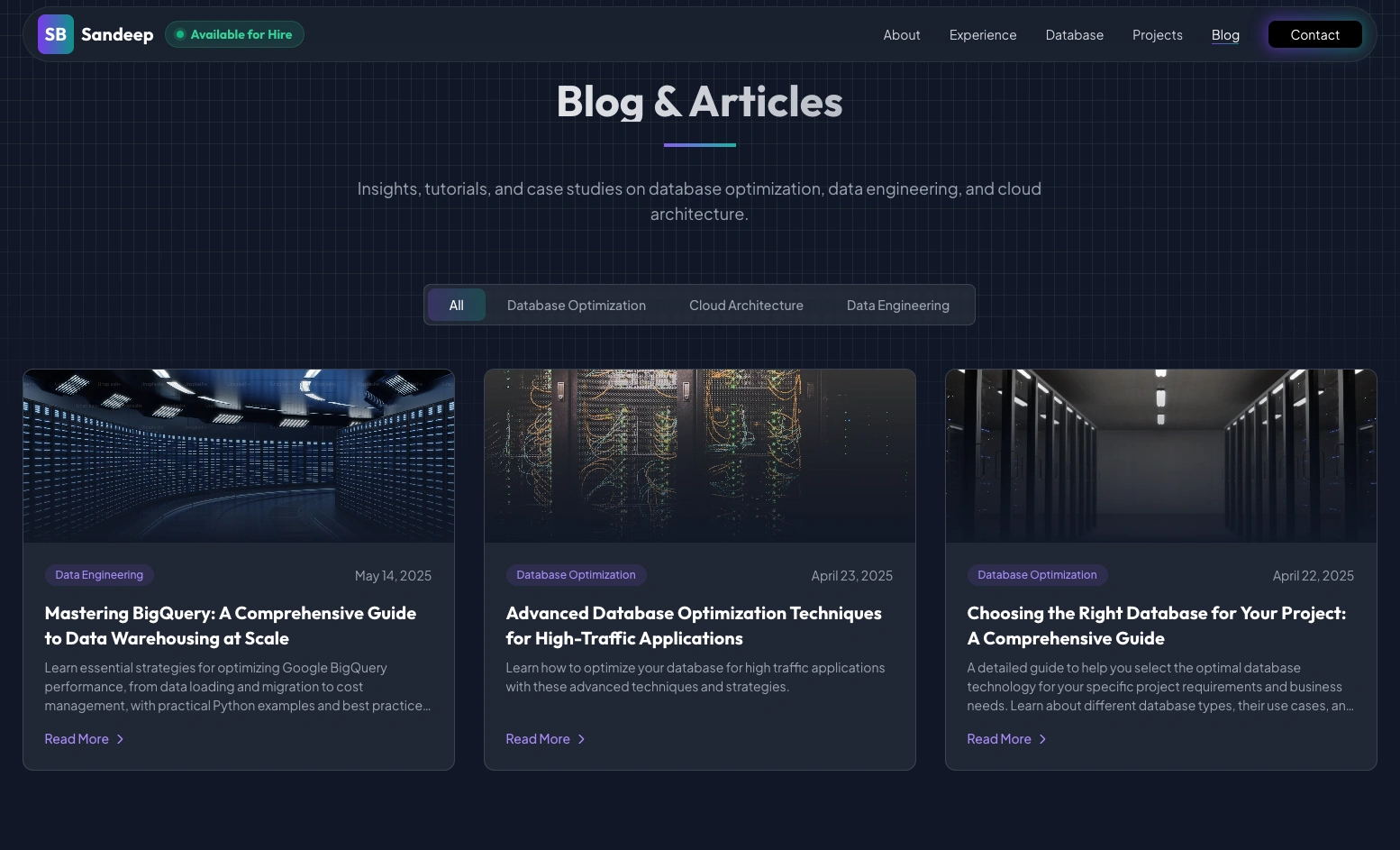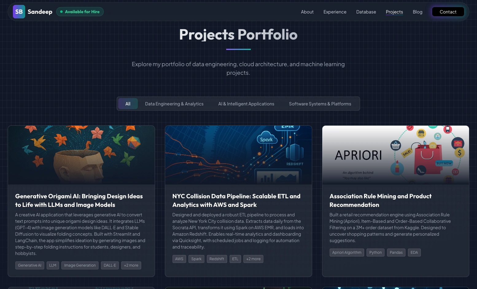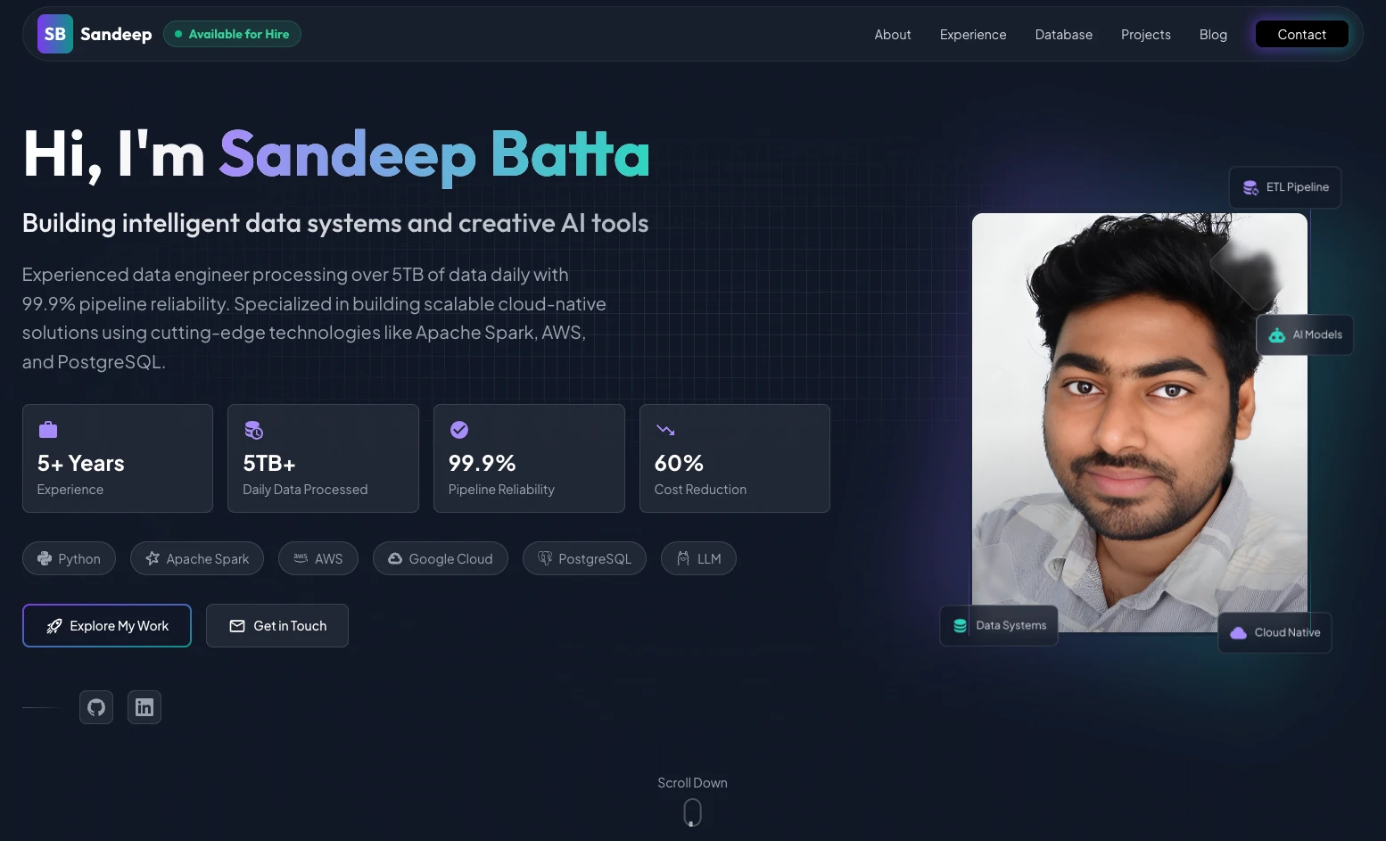 Bolt, designed to showcase my work in web apps, data engineering, and AI. The site includes a dedicated blog, making it easy to add new posts directly via the codebase — perfect for sharing project insights, tutorials, and experiments with LLMs, image models, and cloud tools. Netlify handles the hosting, while I focus on design, clarity, and storytelling.