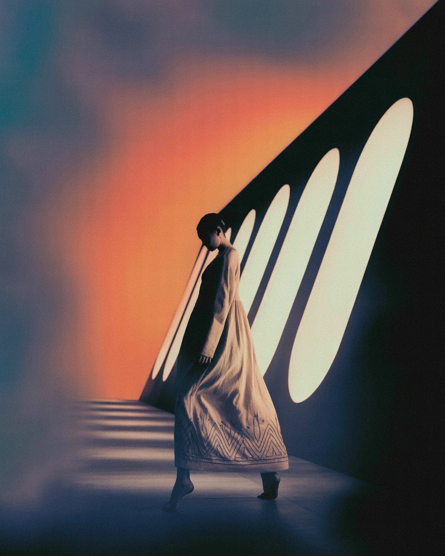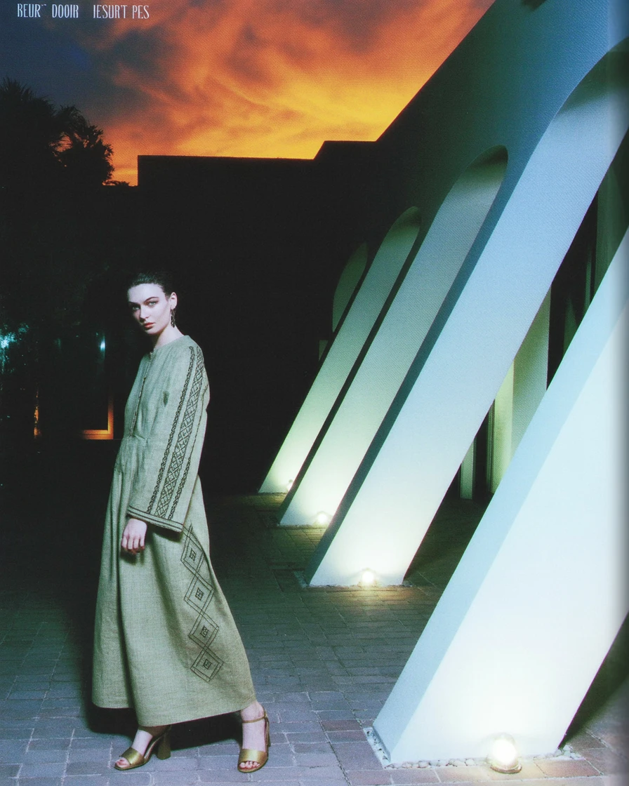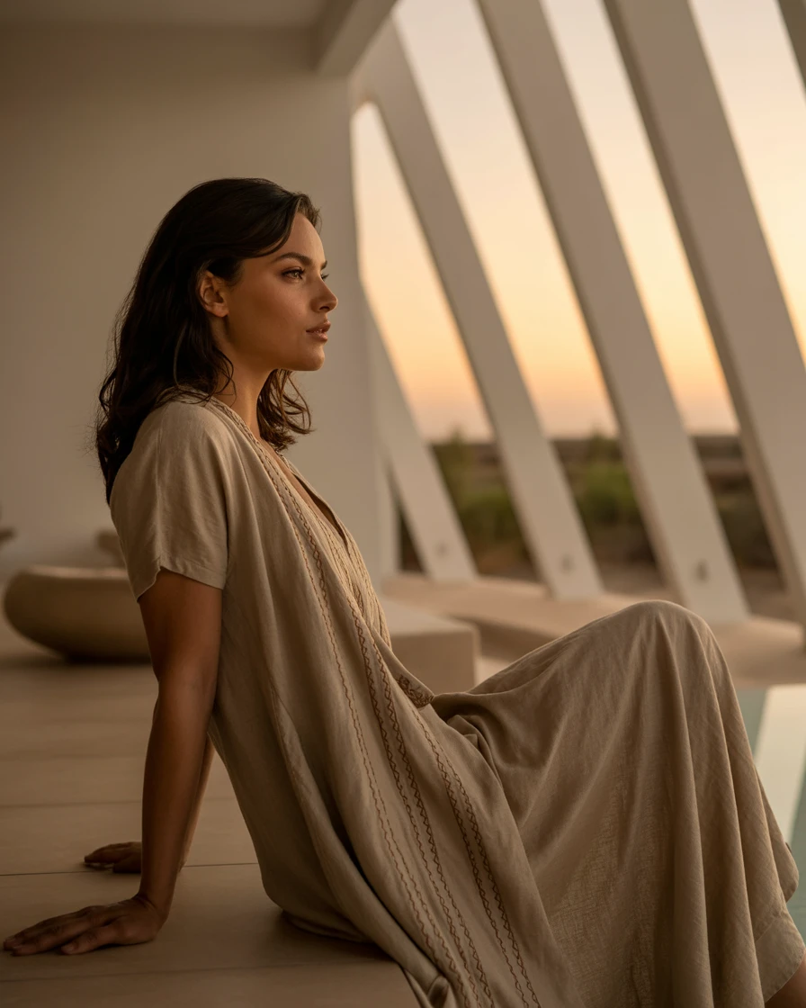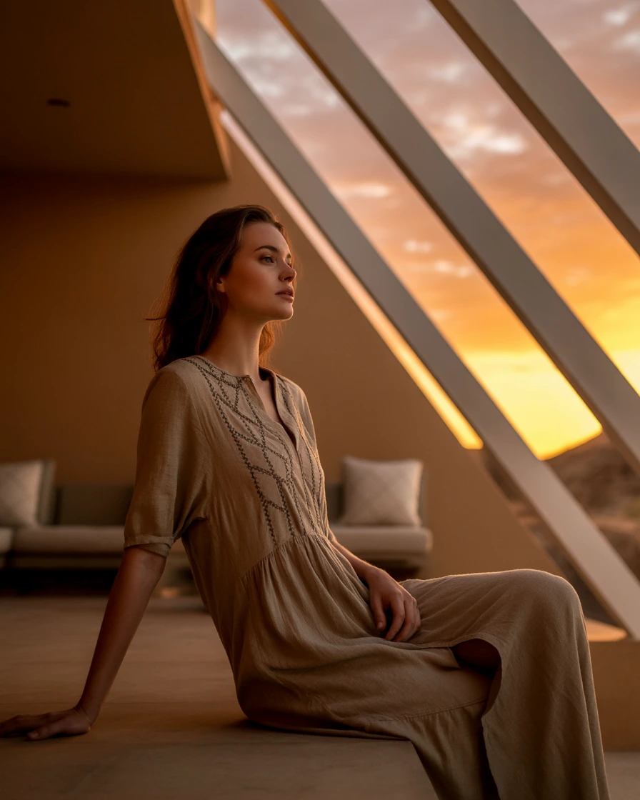 A captivating fashion editorial featuring a female model in a flowing, sand-colored linen dress with geometric embroidery, posed elegantly