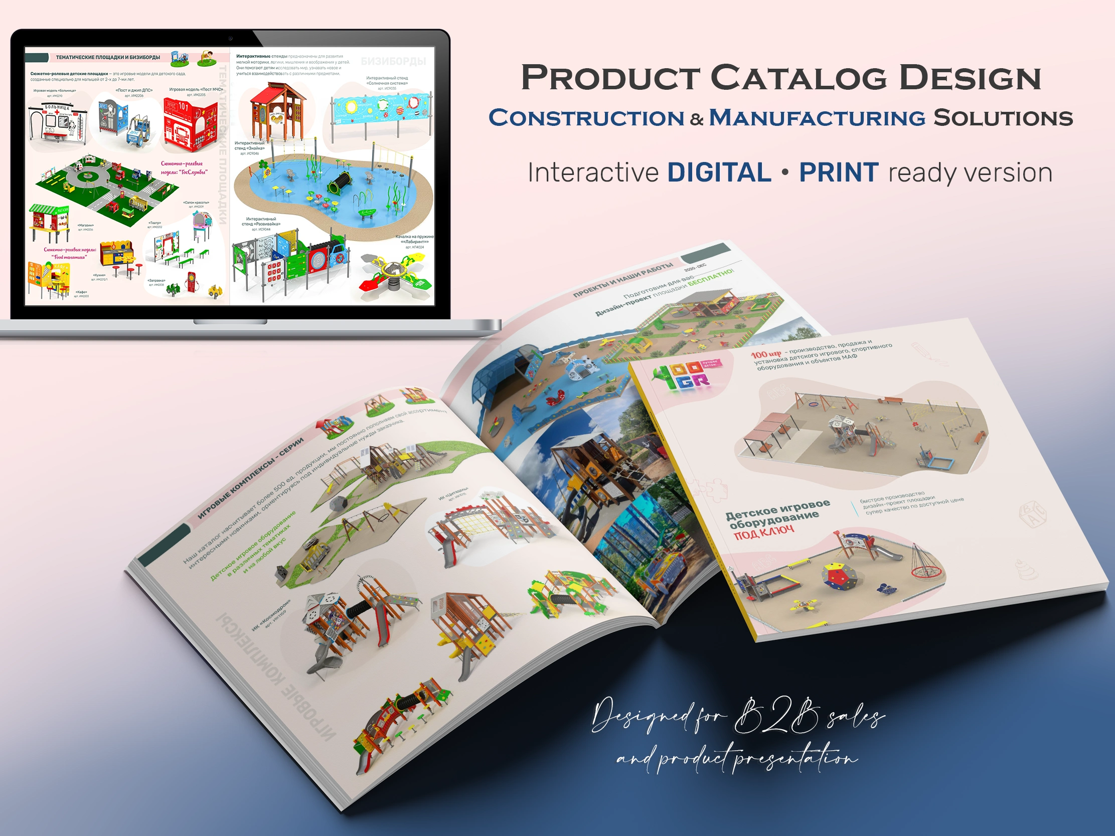 Product catalog designed for a playground equipment manufacturer, delivered as an interactive PDF and print-ready version for B2B sales and presentations.