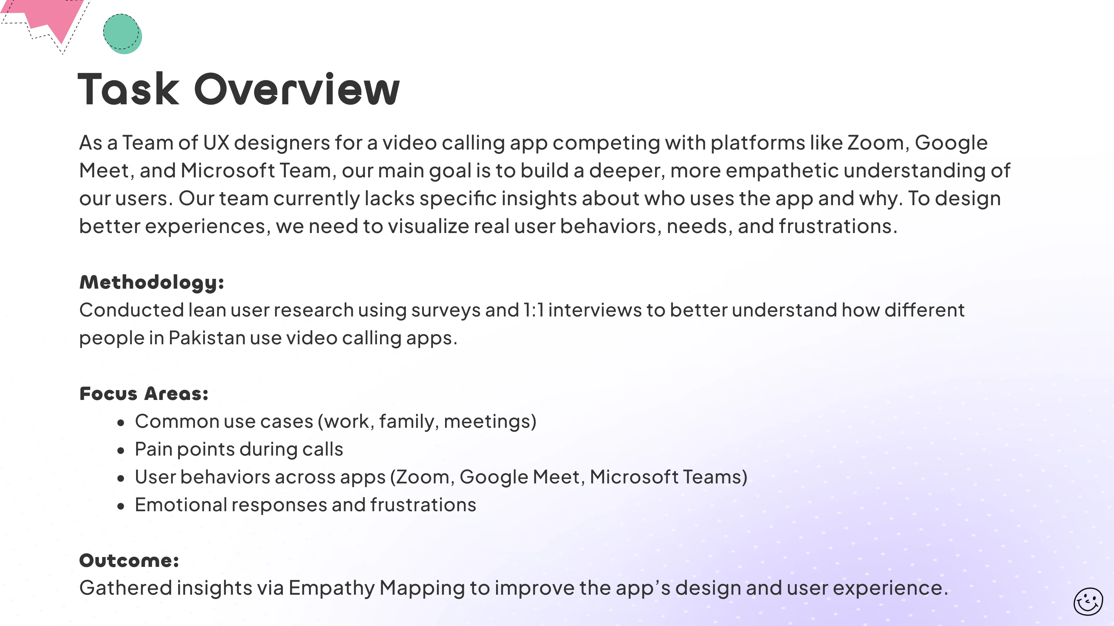 A video calling app tailored for users in Pakistan, designed through lean research and empathy mapping. Focused on real-life use cases like work, family, and m…